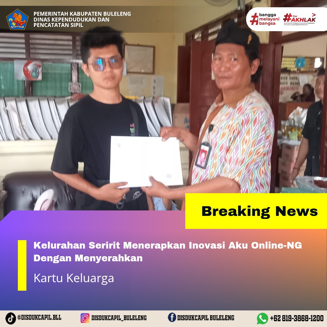 Pemerintah Kabupaten Buleleng melalui Dinas Kependudukan dan Pecatatan Sipil (Disdukcapil) Kabupaten Buleleng memaksimalkan serta mempermudah pelayanan kependudukan masyarakat dengan beberapa inovasi, melalui aplikasi AKU Online-NG. Dimana dalam penerapan aplikasi Aku Online-NG tersebut masyarakat tidak perlu lagi datang ke Dinas Dukcapil untuk melakukan pelayanan langsung cukup dengan datang ke Desa nanti akan dibantu oleh operator Desa masing-masing. Di Kelurahan Seririt Kecamatan Seririt, telah diserahkan dokumen kependudukan berupa Kartu Keluarga atas nama Iqram Novendy yang diserahkan langsung oleh Operator Kelurahan Seririt Kecamatan Seririt, Kabupaten Buleleng, Kamis (27/11).