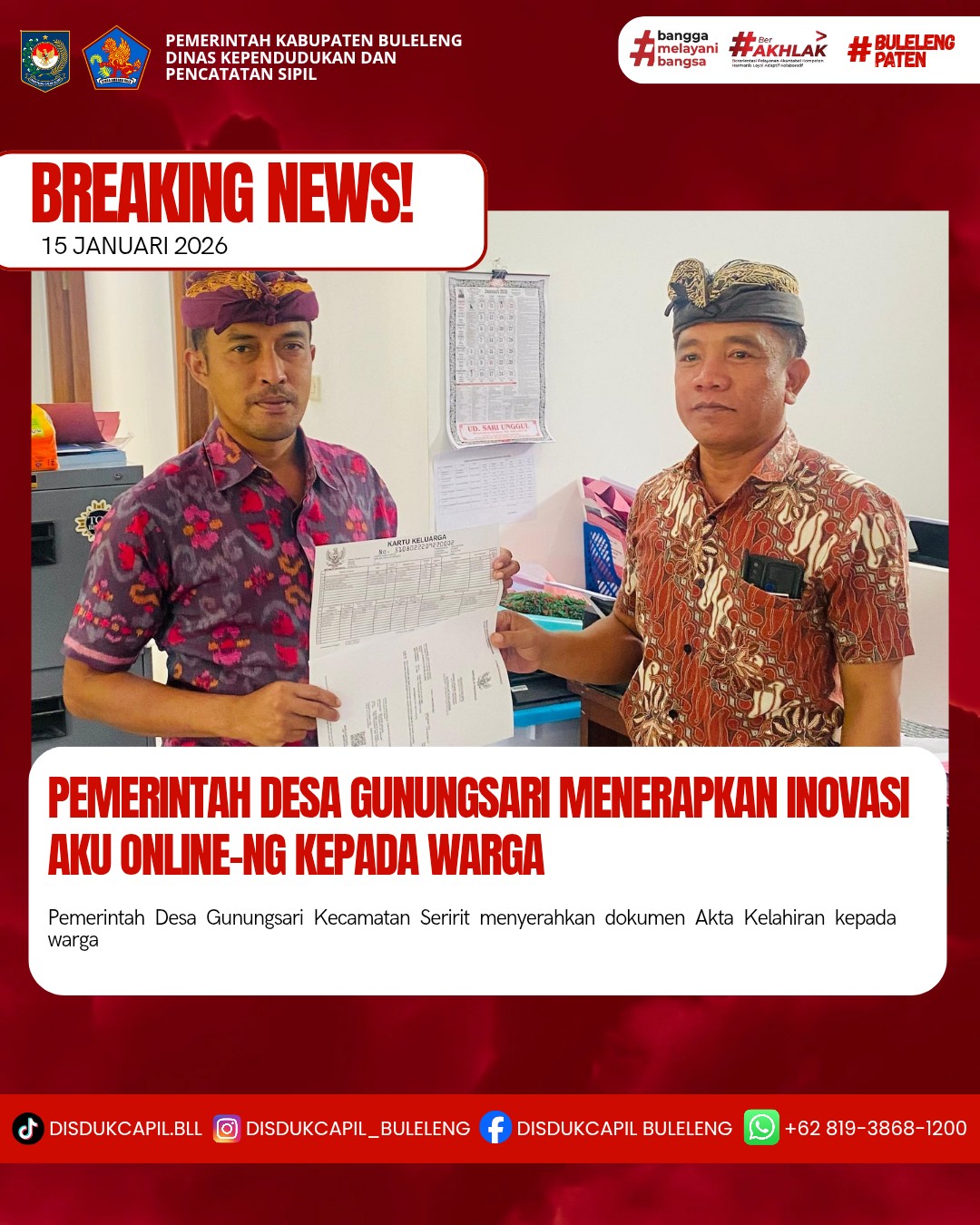 Pemerintah Kabupaten Buleleng melalui Dinas Kependudukan dan Pecatatan Sipil (Disdukcapil) Kabupaten Buleleng memaksimalkan serta mempermudah pelayanan kependudukan masyarakat dengan beberapa inovasi, melalui aplikasi AKU Online-NG. Dimana dalam penerapan aplikasi Aku Online-NG tersebut masyarakat tidak perlu lagi datang ke Dinas Dukcapil untuk melakukan pelayanan langsung cukup dengan datang ke Desa nanti akan dibantu oleh operator Desa masing-masing. Di Desa Gunungsari Kecamatan Seririt, telah diserahkan dokumen kependudukan berupa Akta Kelahiran atas nama NI KOMANG AYU SETYA PUTRI warga Banjar Dinas Puspajati, Desa Gunungsari yang diserahkan oleh Pemerintah Desa Gunungsari kepada warga Banjar Dinas Puspajati Desa Gunungsari, bertempat di Kantor Perbekel Desa Gunungsari, Kecamatan Seririt, Kabupaten Buleleng, Kamis (15/1).