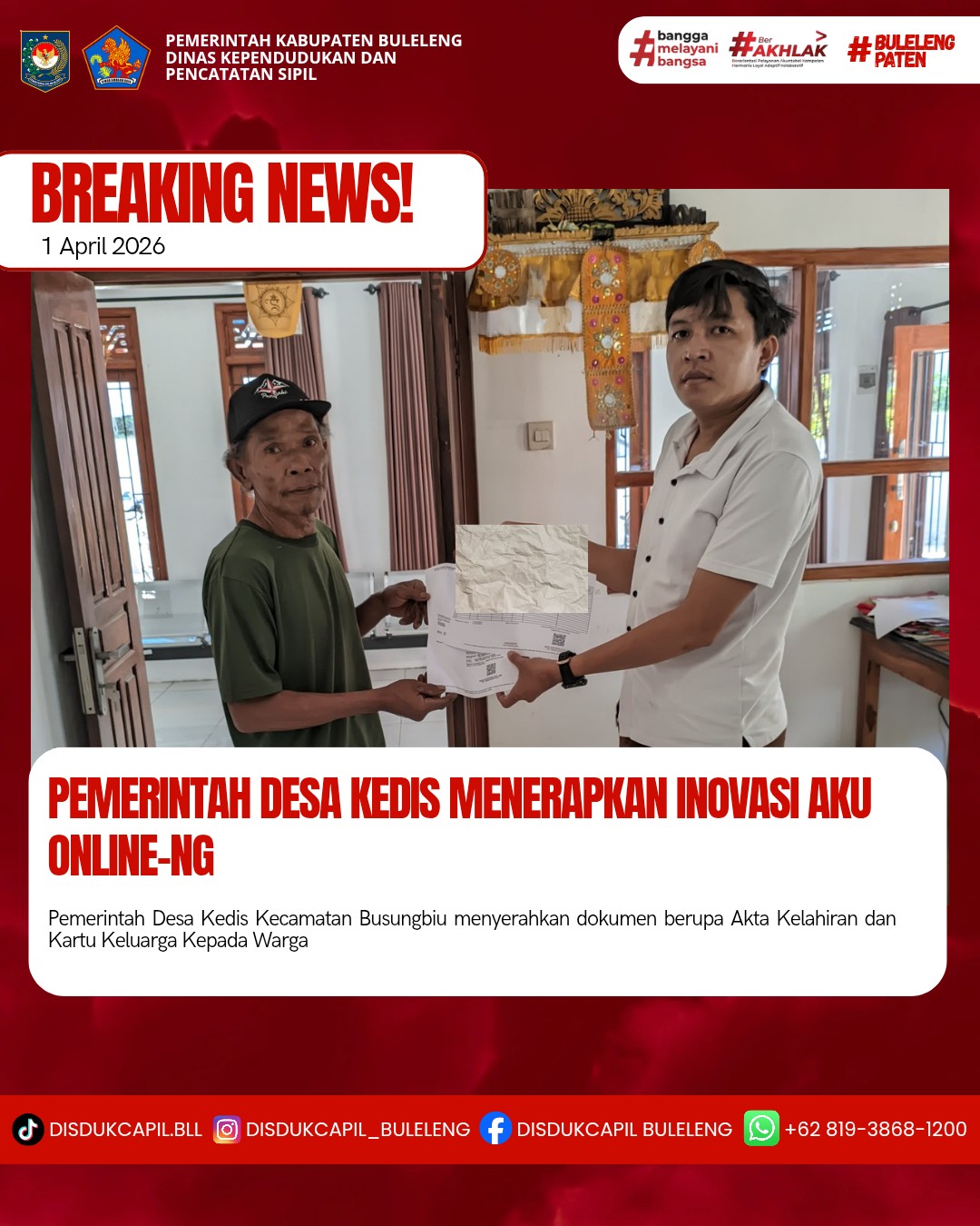 Pemerintah Kabupaten Buleleng melalui Dinas Kependudukan dan Pecatatan Sipil (Disdukcapil) Kabupaten Buleleng memaksimalkan serta mempermudah pelayanan kependudukan masyarakat dengan beberapa inovasi, melalui aplikasi AKU Online-NG. Dimana dalam penerapan aplikasi Aku Online-NG tersebut masyarakat tidak perlu lagi datang ke Dinas Dukcapil untuk melakukan pelayanan langsung, cukup dengan datang ke Desa nanti akan dibantu oleh operator Desa masing-masing. Di Desa Kedis Kecamatan Busungbiu, telah diserahkan dokumen kependudukan berupa Akta Kelahiran dan Kartu Keluarga atas nama Nyoman Suradnya yang diserahkan langsung oleh Kasi Pemerintahan Desa Kedis Kadek Dita Yudistira, Rabu (1/4).