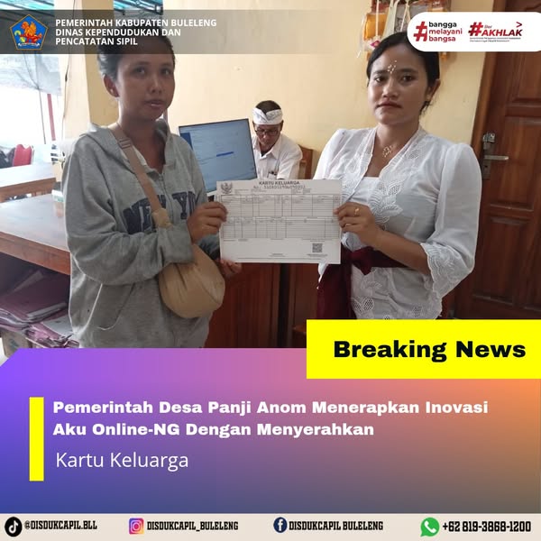 Pemerintah Kabupaten Buleleng melalui Dinas Kependudukan dan Pecatatan Sipil (Disdukcapil) Kabupaten Buleleng memaksimalkan serta mempermudah pelayanan kependudukan masyarakat dengan beberapa inovasi, melalui aplikasi AKU Online-NG. Dimana dalam penerapan aplikasi Aku Online-NG tersebut masyarakat tidak perlu lagi datang ke Dinas Dukcapil untuk melakukan pelayanan langsung cukup dengan datang ke Desa nanti akan dibantu oleh operator Desa masing-masing. Di Desa Panji Anom Kecamatan Sukasada, telah diserahkan dokumen kependudukan berupa Kartu Keluarga atas nama MADE DANA yang diserahkan secara langsung oleh Operator Desa Panji Anom , Senin (22/9).