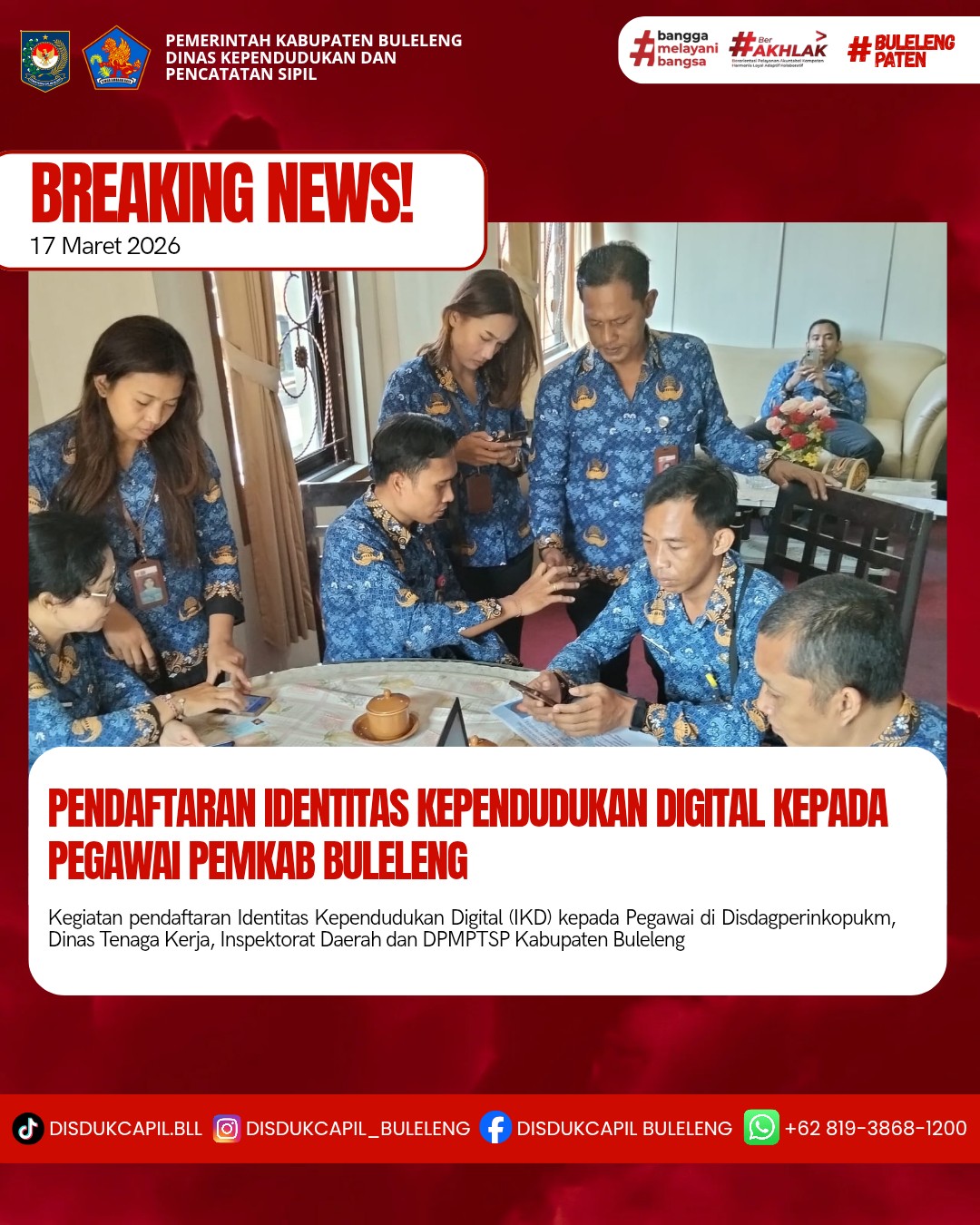 Menerapkan aturan pemerintah tersebut, Dinas Kependudukan dan Pencatatan Sipil Kabupaten Buleleng menyelenggarakan Pendaftaran Identitas Kependudukan Digital ke sekolah-sekolah, Dinas, Lembaga dan Perusahaan secara bergilir setiap harinya. Kali ini pelaksanaan pendaftaran Identitas Kependudukan Digital kepada Pegawai yang dilaksanakan di Disdagperinkopukm, Dinas Tenaga Kerja, Inspektorat Daerah dan DPMPTSP Kabupaten Buleleng, Selasa (17/3).