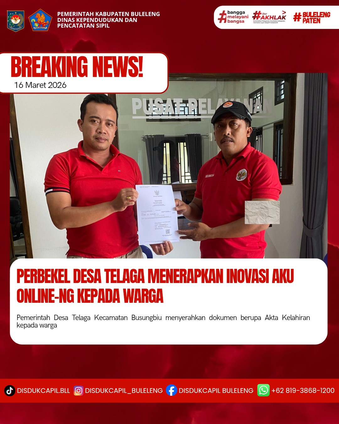 Pemerintah Kabupaten Buleleng melalui Dinas Kependudukan dan Pecatatan Sipil (Disdukcapil) Kabupaten Buleleng memaksimalkan serta mempermudah pelayanan kependudukan masyarakat dengan beberapa inovasi, melalui aplikasi AKU Online-NG. Dimana dalam penerapan aplikasi Aku Online-NG tersebut masyarakat tidak perlu lagi datang ke Dinas Dukcapil untuk melakukan pelayanan langsung cukup dengan datang ke Desa nanti akan dibantu oleh operator Desa masing-masing. Di Desa Telaga Kecamatan Busungbiu, telah diserahkan dokumen kependudukan berupa Akta lahir atas nama Kadek Agus Arya Setiawan diserahkan langsung oleh Perbekel Desa Telaga Made Hendra Mahayuda,S.Pd yang bertempat di Kantor Perbekel Desa Telaga yang beralamat di Banjar Dinas Kumuda Loka, Desa Telaga, Kecamatan Busungbiu, Kabupaten Buleleng, Senin (16/3).