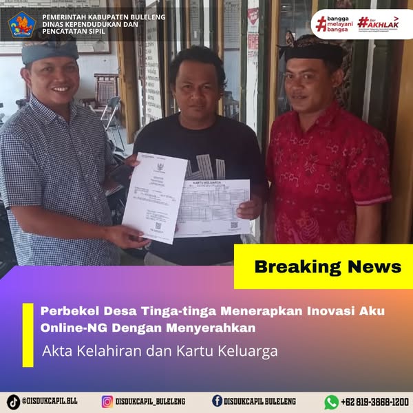Pemerintah Kabupaten Buleleng melalui Dinas Kependudukan dan Pecatatan Sipil (Disdukcapil) Kabupaten Buleleng memaksimalkan serta mempermudah pelayanan kependudukan masyarakat dengan beberapa inovasi, melalui aplikasi AKU Online. Dimana dalam penerapan aplikasi Aku Online tersebut masyarakat tidak perlu lagi datang ke Dinas Dukcapil untuk melakukan pelayanan langsung cukup dengan datang ke Desa nanti akan dibantu oleh operator Desa masing-masing. Di Desa Tinga-Tinga Kecamatan Gerokgak telah diserahkan dokumen kependudukan berupa Akta Kelahiran atas nama GEDE ARYA WIDI NUGRAHA dan Kartu Keluarga atas nama KADEK MULYASTRA yang diserahkan oleh Bapak Perbekel Tinga-tinga I Komang Adi Wirawan di dampingi Kelian Banjar Dinas Taman Sari I Putu Mardika Dea Tinga-Tinga,Kecamatan Gerokgak , Kamis (16/10).