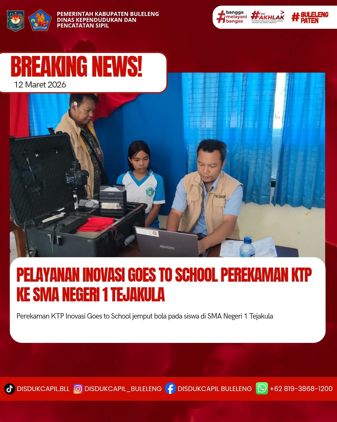 Pada kali ini Kamis, 12 Maret 2026 pelayanan perekaman KTP-el dilaksanakan di SMA Negeri 1 Tejakula. Hasil perekaman di SMA Negeri 1 Tejakula dengan data BNBA sebanyak 257 orang dan total yang melakukan perekaman sebanyak 69 orang, dimana hasil perekaman data di dalam BNBA sebanyak 62 orang dan data diluar BNBA sebanyak 7 orang yang melakukan perekaman. Dilihat dari hasil tersebut sisa data BNBA yang belum perekaman sebanyak 195 orang keterangan dari pihak sekolah untuk sisa BNBA sudah diinformasikan oleh sekolah tapi siswa tidak datang perekaman karena siswa jeda semester dan pulang jam 12 siang.