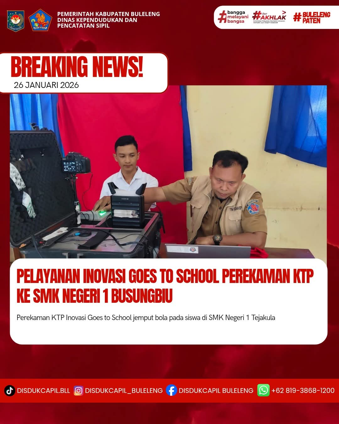 Pada kali ini Senin, 26 Januari 2026 pelayanan perekaman KTP-el dilaksanakan di SMK Negeri 1 Busungbiu. Hasil perekaman di SMK Negeri 1 Busungbiu dengan data BNBA sebanyak 171 orang dan total yang melakukan perekaman sebanyak 115 orang, dimana hasil perekaman data di dalam BNBA sebanyak 115 orang dan tidak ada data di luar BNBA yang melakukan perekaman. Dilihat dari hasil tersebut sisa data BNBA yang belum perekaman sebanyak 56 orang keterangan dari pihak sekolah siswa yang belum perekaman siswa kelas 11 karena sudah jam pulang.