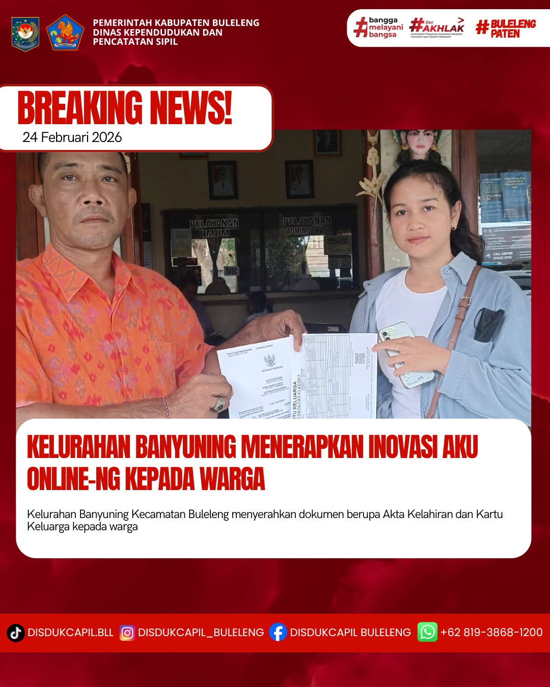 Pemerintah Kabupaten Buleleng melalui Dinas Kependudukan dan Pecatatan Sipil (Disdukcapil) Kabupaten Buleleng memaksimalkan serta mempermudah pelayanan kependudukan masyarakat dengan beberapa inovasi, melalui aplikasi AKU Online-NG. Dimana dalam penerapan aplikasi Aku Online-NG tersebut masyarakat tidak perlu lagi datang ke Dinas Dukcapil untuk melakukan pelayanan langsung cukup dengan datang ke Desa nanti akan dibantu oleh operator Desa masing-masing. Di Kelurahan Banyuning Kecamatan Buleleng, telah diserahkan dokumen kependudukan berupa Akta Kelahiran dan Kartu Keluarga atas nama Kadek Viona Arunika Vidyananti warga Kelurahan Banyuning yang diserahkan langsung oleh Kepala Lingkungan Banyuning Barat Kelurahan Banyuning Kecamatan Buleleng, Kabupaten Buleleng, Selasa (24/2).