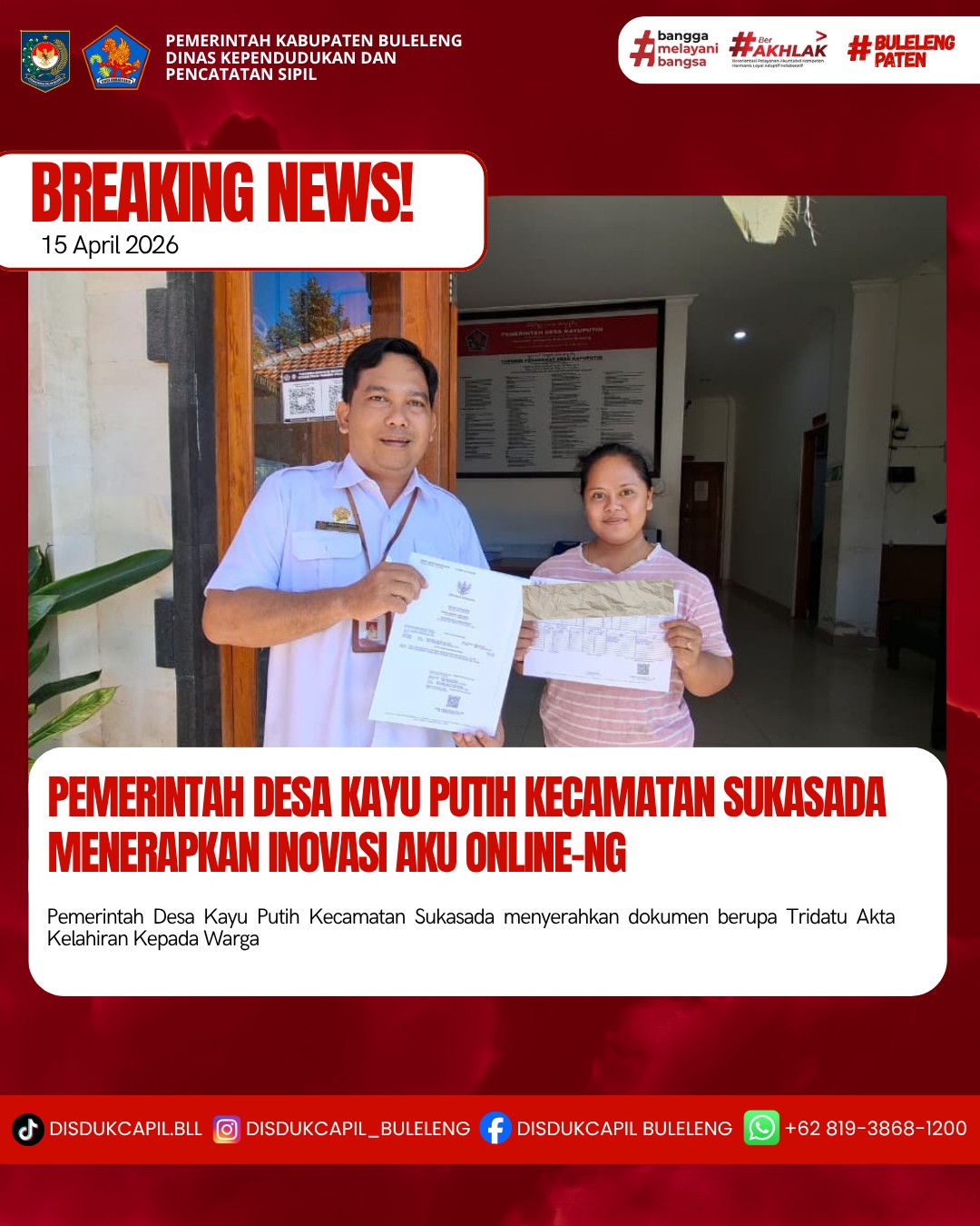 Pemerintah Kabupaten Buleleng melalui Dinas Kependudukan dan Pecatatan Sipil (Disdukcapil) Kabupaten Buleleng memaksimalkan serta mempermudah pelayanan kependudukan masyarakat dengan beberapa inovasi, melalui aplikasi AKU Online-NG. Dimana dalam penerapan aplikasi Aku Online-NG tersebut masyarakat tidak perlu lagi datang ke Dinas Dukcapil untuk melakukan pelayanan langsung cukup dengan datang ke Desa nanti akan dibantu oleh operator Desa masing-masing. Di Desa Kayu Putih Kecamatan Sukasada, telah diserahkan dokumen kependudukan berupa Akta Kelahiran atas nama Putu Pasek Indra Wirawan dan Kartu Keluarga atas nama Made Masdana yang diserahkan secara langsung oleh Sekretaris Desa Kayu Putih Kecamatan Sukasada, Rabu (15/4).