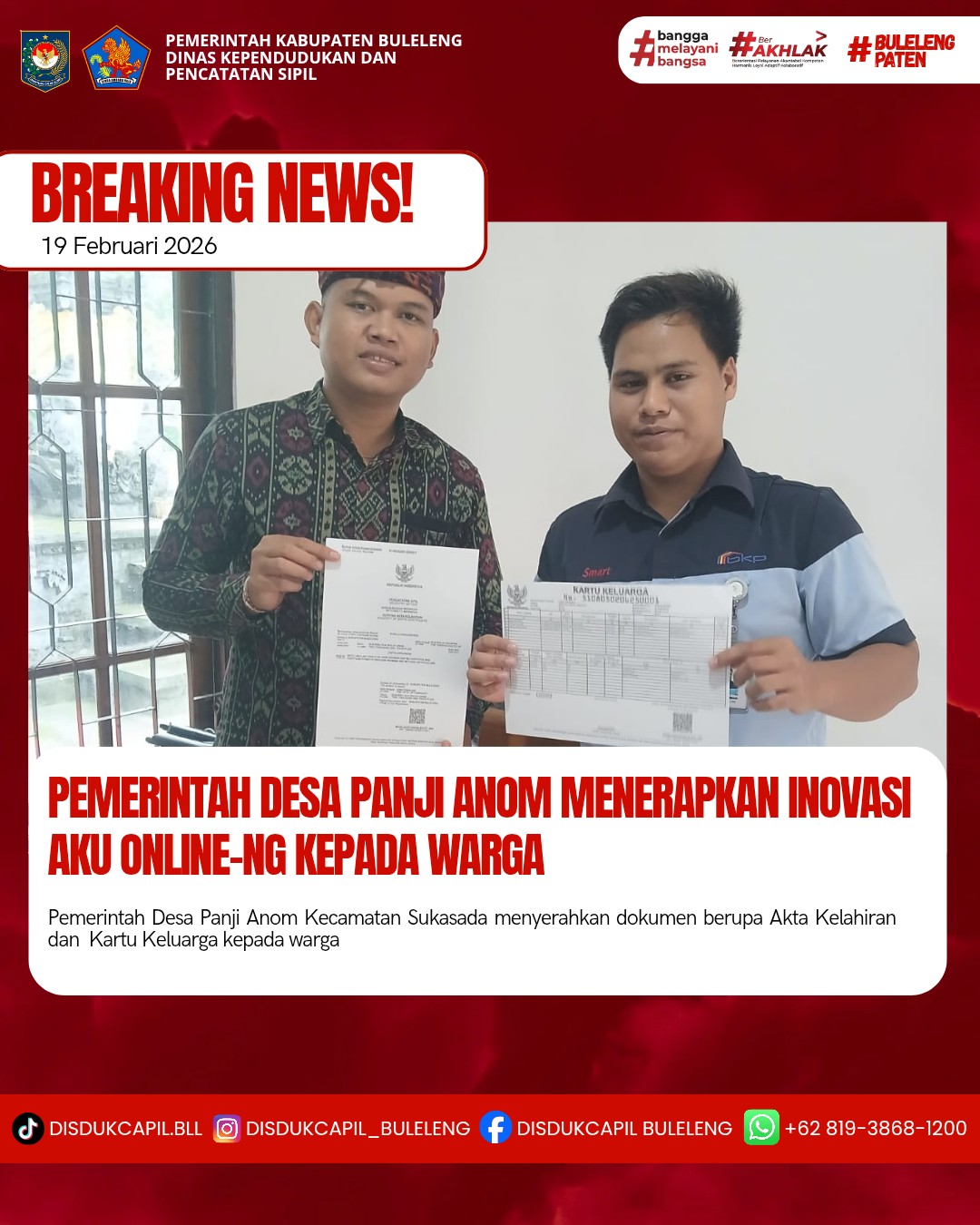 Pemerintah Kabupaten Buleleng melalui Dinas Kependudukan dan Pecatatan Sipil (Disdukcapil) Kabupaten Buleleng memaksimalkan serta mempermudah pelayanan kependudukan masyarakat dengan beberapa inovasi, melalui aplikasi AKU Online-NG. Dimana dalam penerapan aplikasi Aku Online-NG tersebut masyarakat tidak perlu lagi datang ke Dinas Dukcapil untuk melakukan pelayanan langsung cukup dengan datang ke Desa nanti akan dibantu oleh operator Desa masing-masing. Di Desa Panji Anom Kecamatan Sukasada, telah diserahkan dokumen kependudukan berupa Akta Kelahiran atas nama DAFFA ARRAHMAN dan Kartu Keluarga atas nama DANI RAHMA yang diserahkan langsung oleh Kasi Pemerintahan Desa Panji Anom bertempat di Kantor Perbekel Panji Anom, Kecamatan Sukasada, Kamis (19/2).