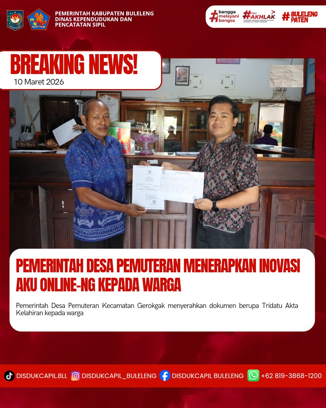 Pemerintah Kabupaten Buleleng melalui Dinas Kependudukan dan Pecatatan Sipil (Disdukcapil) Kabupaten Buleleng memaksimalkan serta mempermudah pelayanan kependudukan masyarakat dengan beberapa inovasi, melalui aplikasi AKU Online-NG. Dimana dalam penerapan aplikasi Aku Online-NG tersebut masyarakat tidak perlu lagi datang ke Dinas Dukcapil untuk melakukan pelayanan langsung cukup dengan datang ke Desa nanti akan dibantu oleh operator Desa masing-masing. Di Desa Pemuteran Kecamatan Gerokgak, telah diserahkan dokumen kependudukan berupa Tridatu Akta Kelahiran atas nama PUTU DARMIKA yang diserahkan langsung oleh Kasi Pemerintahan Desa Pemuteran, Selasa (10/3).