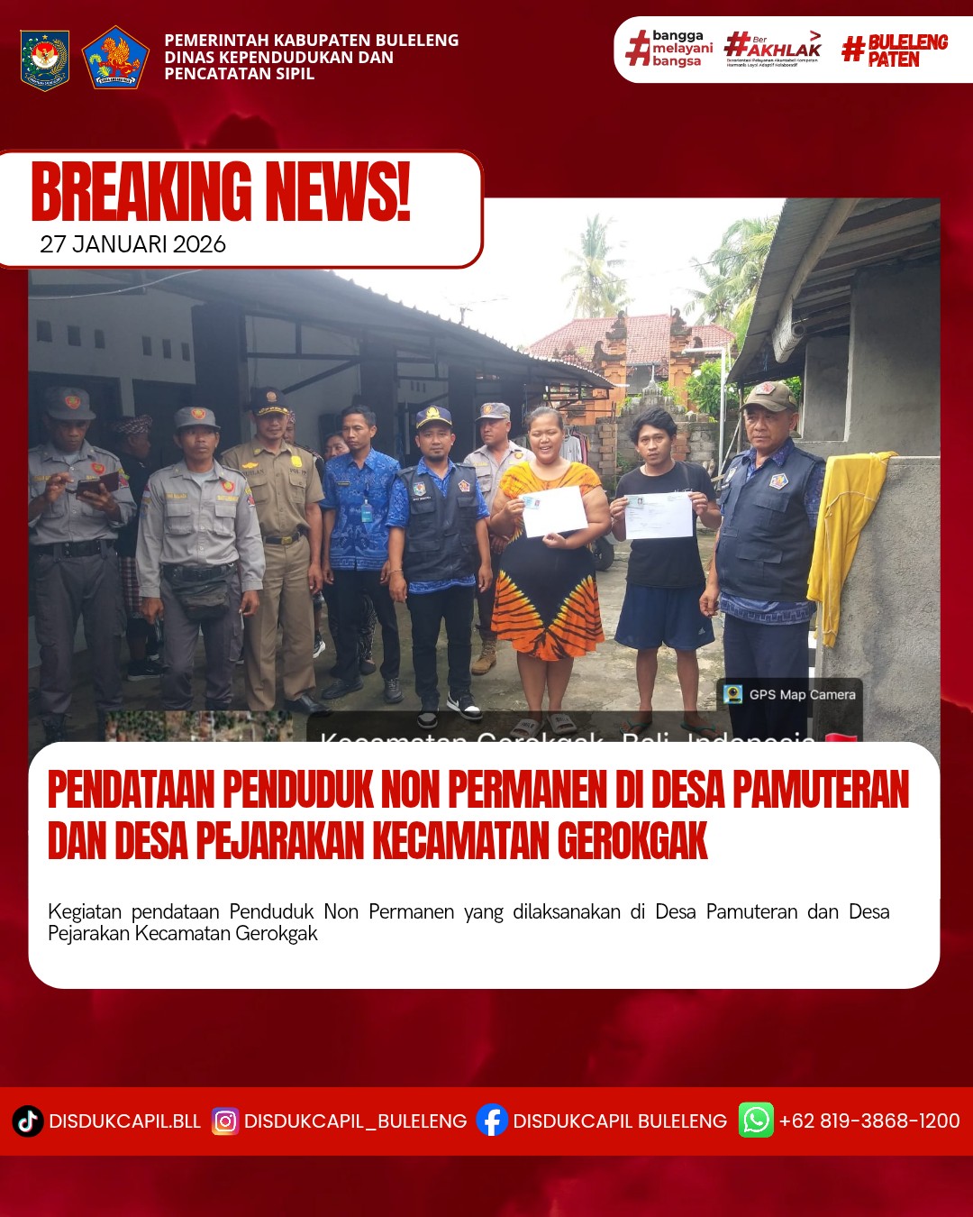 Kali ini Selasa, 27 Januari 2026, Dinas Kependudukan dan Pencatatan Sipil Kabupaten Buleleng melaksanakan kegiatan pendataan penduduk Non Permanen di Desa Pamuteran dan Desa Pejarakan Kecamatan Gerokgak. Dari pendataan penduduk kali ini didapatkan hasil :