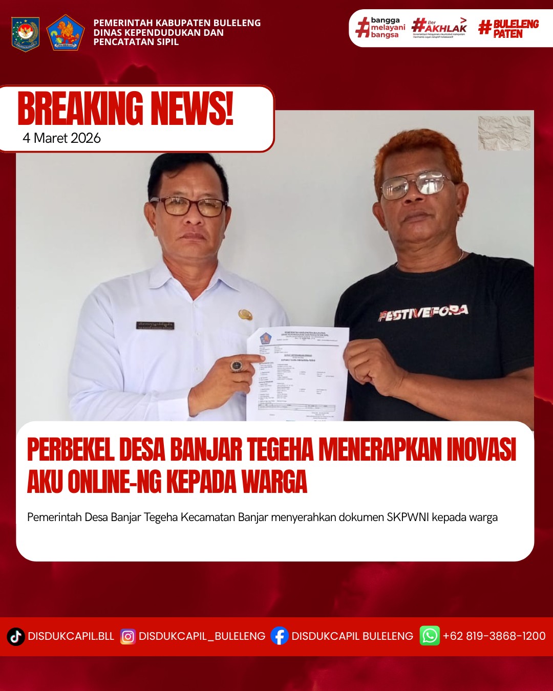 Pemerintah Kabupaten Buleleng melalui Dinas Kependudukan dan Pecatatan Sipil (Disdukcapil) Kabupaten Buleleng memaksimalkan serta mempermudah pelayanan kependudukan masyarakat dengan beberapa inovasi, melalui aplikasi AKU Online-NG. Dimana dalam penerapan aplikasi Aku Online-NG tersebut masyarakat tidak perlu lagi datang ke Dinas Dukcapil untuk melakukan pelayanan langsung cukup dengan datang ke Desa nanti akan dibantu oleh operator Desa masing-masing. Di Desa Banjar Tegeha Kecamatan Banjar, telah diserahkan dokumen kependudukan berupa SKPWNI atas nama Kadek Raditya Permadi warga Desa Banjar Dinas Abian Desa Banjar Tegeha yang diserahkan secara langsung oleh Perbekel Desa Banjar Tegeha Ida Bagus Komang Sistiadi, Rabu (4/3).