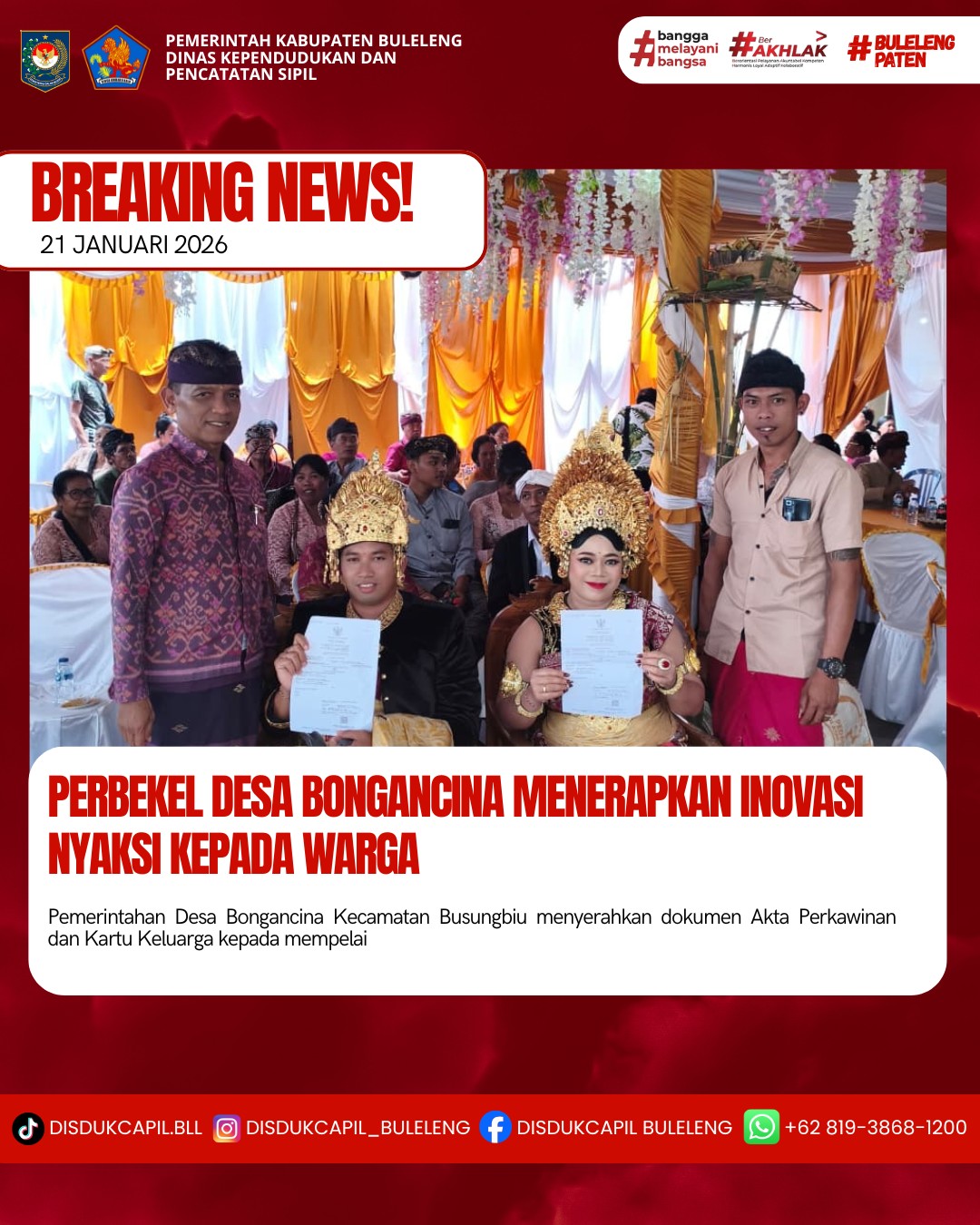Pemerintah Kabupaten Buleleng melalui Dinas Kependudukan dan Pecatatan Sipil (Disdukcapil) Kabupaten Buleleng memaksimalkan serta mempermudah pelayanan kependudukan masyarakat dengan beberapa inovasi, yakni BALITA (Bayi Lahir Berakta), NYAKSI (Menyerahkan Akta Kawin Saat Acara Perkawinan) dan AKSAMA ( Akta Kematian Diserahkan Saat Masih Berduka) melalui aplikasi Aku Online-NG. Di Desa Bongancina Kecamatan Busungbiu, telah diterapkan program NYAKSI (Menyerahkan Akta Perkawinan Saat Acara Perkawinan) yang dilakukan secara langsung oleh Perbekel Desa Bongancina Dewa Made Sariana dengan menyerahkan Akta Perkawinan dan Kartu Keluarga kepada kedua mempelai dan masing-masing orang tua mempelai di Desa Bongancina Kecamatan Busungbiu, Rabu (21/1).