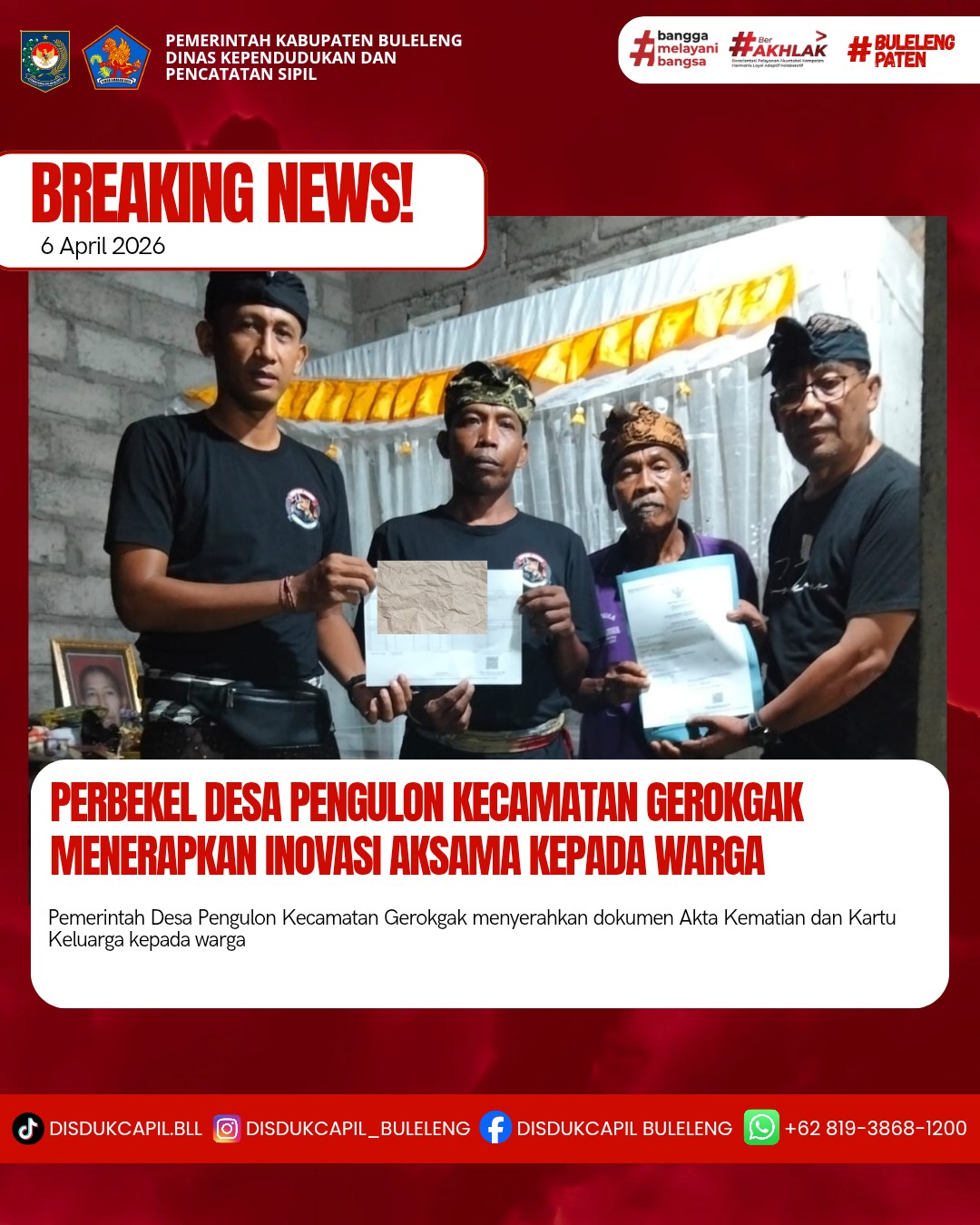 Pemerintah Kabupaten Buleleng melalui Dinas Kependudukan dan Pecatatan Sipil (Disdukcapil) Kabupaten Buleleng memaksimalkan serta mempermudah pelayanan kependudukan masyarakat dengan beberapa inovasi, yakni BALITA (Bayi Lahir Berakta), NYAKSI (Menyerahkan Akta Kawin Saat Acara Perkawinan) dan AKSAMA ( Akta Kematian Diserahkan Saat Masih Berduka) melalui aplikasi Aku Online-NG. Di Desa Pengulon Kecamatan Gerokgak, telah diterapkan program Aksama (Akta Kematian Diserahkan Saat Masih Berduka) yang dilakukan secara langsung oleh Perbekel Desa Pengulon Drs. I Nyoman Juliana dengan menyerahkan Akta Kematian atas nama Nyoman Redani dan Kartu Keluarga atas nama Ketut Santra kepada pihak keluarga di rumah duka di Desa Pengulon, Senin (6/4).