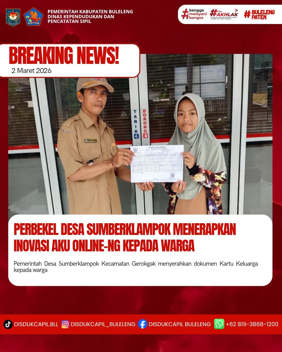 Pemerintah Kabupaten Buleleng melalui Dinas Kependudukan dan Pecatatan Sipil (Disdukcapil) Kabupaten Buleleng memaksimalkan serta mempermudah pelayanan kependudukan masyarakat dengan beberapa inovasi, melalui aplikasi AKU Online-NG. Dimana dalam penerapan aplikasi Aku Online-NG tersebut masyarakat tidak perlu lagi datang ke Dinas Dukcapil untuk melakukan pelayanan langsung cukup dengan datang ke Desa nanti akan dibantu oleh operator Desa masing-masing. Di Desa Sumberklampok Kecamatan Gerokgak, telah diserahkan dokumen kependudukan berupa Kartu Keluarga atas nama Cindi Aulia yang diserahkan secara langsung oleh Perbekel Desa Sumberklampok I Wayan Sawitrayasa bertempat di Kantor Perbekel Desa Sumberklampok, Kecamatan Gerokgak, Senin (2/3).