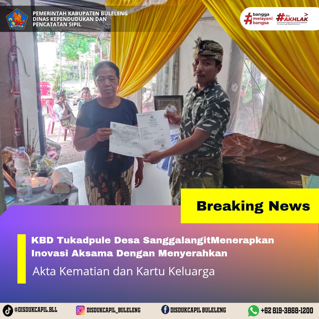Pemerintah Kabupaten Buleleng melalui Dinas Kependudukan dan Pecatatan Sipil (Disdukcapil) Kabupaten Buleleng memaksimalkan serta mempermudah pelayanan kependudukan masyarakat dengan beberapa inovasi, yakni BALITA (Bayi Lahir Berakta), NYAKSI (Menyerahkan Akta Kawin Saat Acara Perkawinan) dan AKSAMA ( Akta Kematian Diserahkan Saat Masih Berduka) melalui aplikasi Aku Online. Di Desa Sanggalangit Kecamatan Gerokgak, telah diterapkan program Aksama (Akta Kematian Diserahkan Saat Masih Berduka) yang dilakukan secara langsung oleh Kelian Banjar Dinas Tukadpule, Desa Sanggalangit dengan menyerahkan Akta Kematian dan Kartu Keluarga kepada Nyoman Supartiasa beralamat Banjar Dinas Tukadpule Desa Sanggalangit, Sabtu (15/11).