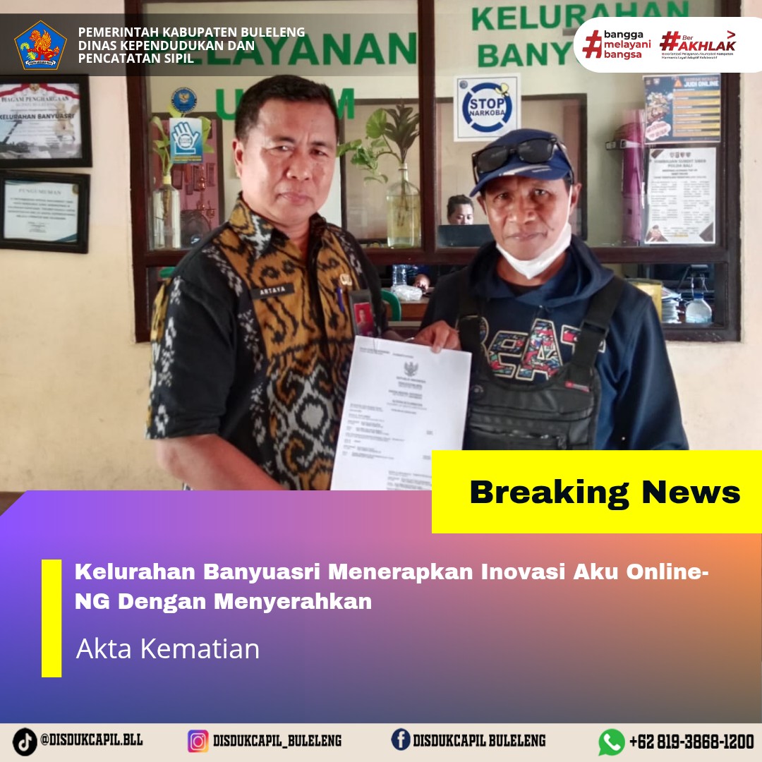Pemerintah Kabupaten Buleleng melalui Dinas Kependudukan dan Pecatatan Sipil (Disdukcapil) Kabupaten Buleleng memaksimalkan serta mempermudah pelayanan kependudukan masyarakat dengan beberapa inovasi, melalui aplikasi AKU Online-NG. Dimana dalam penerapan aplikasi Aku Online-NG tersebut masyarakat tidak perlu lagi datang ke Dinas Dukcapil untuk melakukan pelayanan langsung cukup dengan datang ke Desa nanti akan dibantu oleh operator Desa masing-masing. Di Kelurahan Banyuasri Kecamatan Buleleng, telah diserahkan dokumen kependudukan berupa Akta Kematian atas nama Helena Pati yang beralamat di Kelurahan Banyuasri yang diserahkan langsung oleh Kasi Pembangunan Kelurahan Banyuasri, Kecamatan Buleleng, Kabupaten Buleleng, Selasa (23/12).