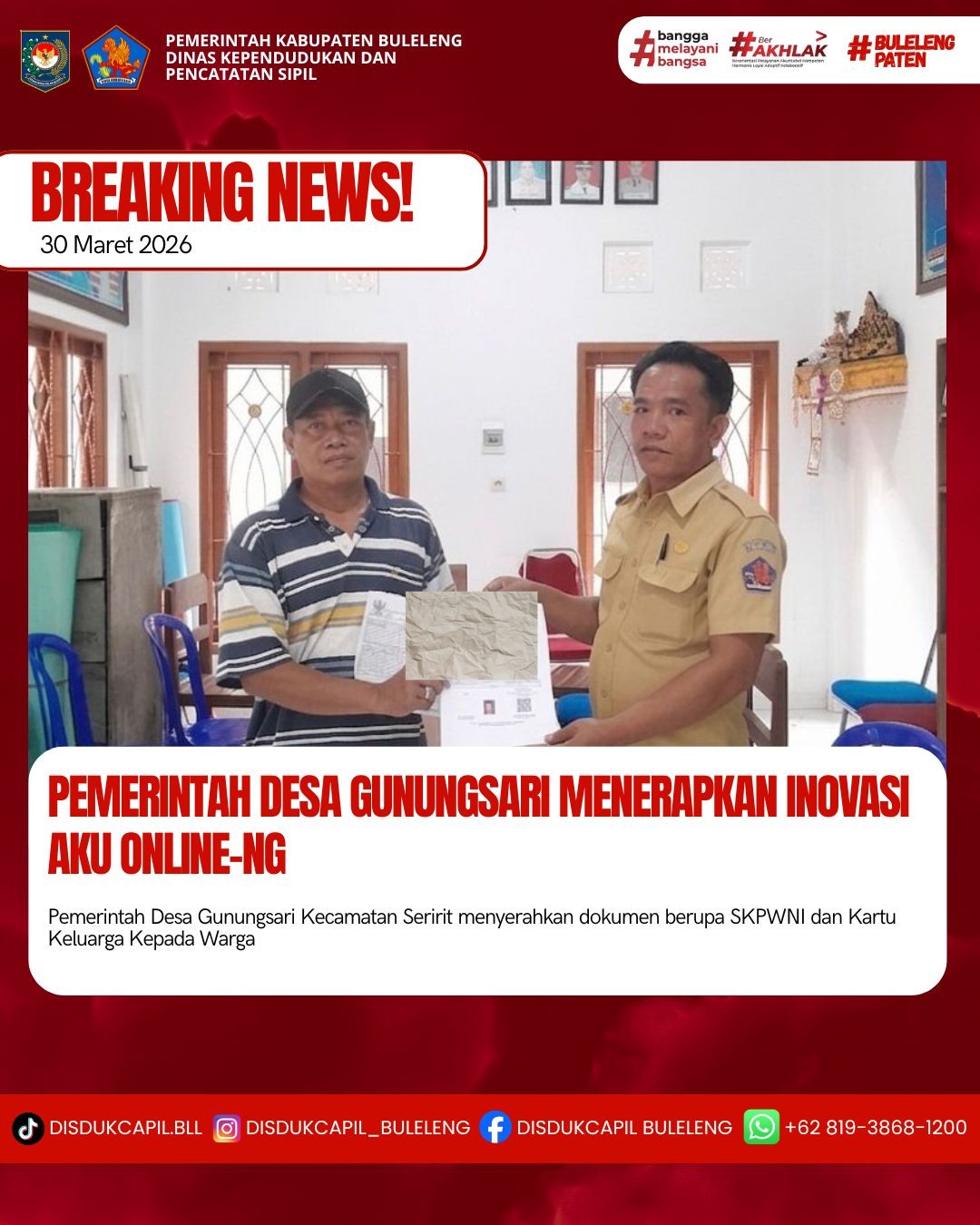 Pemerintah Kabupaten Buleleng melalui Dinas Kependudukan dan Pecatatan Sipil (Disdukcapil) Kabupaten Buleleng memaksimalkan serta mempermudah pelayanan kependudukan masyarakat dengan beberapa inovasi, melalui aplikasi AKU Online-NG. Dimana dalam penerapan aplikasi Aku Online-NG tersebut masyarakat tidak perlu lagi datang ke Dinas Dukcapil untuk melakukan pelayanan langsung, cukup dengan datang ke Desa nanti akan dibantu oleh operator Desa masing-masing. Di Desa Gunungsari Kecamatan Seririt, telah diserahkan dokumen kependudukan berupa SKPWNI atas nama Putu Sutria Tubagus dan Kartu Keluarga atas nama I Ketut Suasa Mahayasa warga Banjar Dinas Sekar, Desa Gunungsari yang diserahkan oleh Pemerintah Desa Gunungsari kepada warga Banjar Dinas Sekar, bertempat di Kantor Perbekel Desa Gunungsari, Kecamatan Seririt, Kabupaten Buleleng, Senin (30/3).