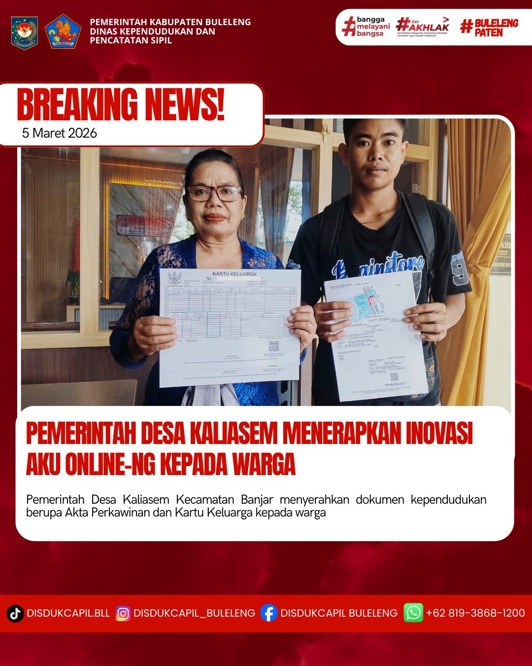 Pemerintah Kabupaten Buleleng melalui Dinas Kependudukan dan Pecatatan Sipil (Disdukcapil) Kabupaten Buleleng memaksimalkan serta mempermudah pelayanan kependudukan masyarakat dengan beberapa inovasi, melalui aplikasi AKU Online. Dimana dalam penerapan aplikasi Aku Online tersebut masyarakat tidak perlu lagi datang ke Dinas Dukcapil untuk melakukan pelayanan langsung cukup dengan datang ke Desa nanti akan dibantu oleh operator Desa masing-masing. Di Desa Kaliasem Kecamatan Banjar telah diserahkan dokumen kependudukan berupa Akta Perkawinan dan Kartu Keluarga atas nama Kadek Sukerta yang diserahkan oleh Kasi Pemerintahan Desa Kaliasem, Kamis (5/3).
