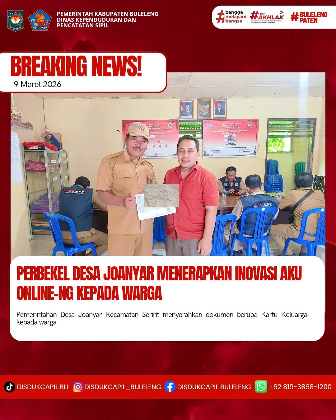 Pemerintah Kabupaten Buleleng melalui Dinas Kependudukan dan Pecatatan Sipil (Disdukcapil) Kabupaten Buleleng memaksimalkan serta mempermudah pelayanan kependudukan masyarakat dengan beberapa inovasi, melalui aplikasi AKU Online-NG. Dimana dalam penerapan aplikasi Aku Online-NG tersebut masyarakat tidak perlu lagi datang ke Dinas Dukcapil untuk melakukan pelayanan langsung cukup dengan datang ke Desa nanti akan dibantu oleh operator Desa masing-masing. Di Desa Joanyar Kecamatan Seririt, telah diserahkan dokumen kependudukan berupa Kartu Keluarga atas nama Made Yudi Artana warga Desa Joanyar Kecamatan Seririt oleh Perbekel Desa Joanyar Nyoman Mas Nesa dan diterima langsung oleh warga, Senin (9/3).