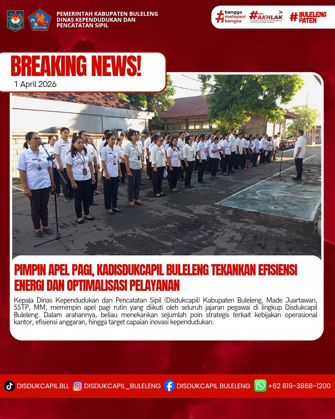 SINGARAJA – Kepala Dinas Kependudukan dan Pencatatan Sipil (Disdukcapil) Kabupaten Buleleng, Made Juartawan, SSTP, MM, memimpin apel pagi rutin yang diikuti oleh seluruh jajaran pegawai di lingkup Disdukcapil Buleleng. Dalam arahannya, beliau menekankan sejumlah poin strategis terkait kebijakan operasional kantor, efisiensi anggaran, hingga target capaian inovasi kependudukan.