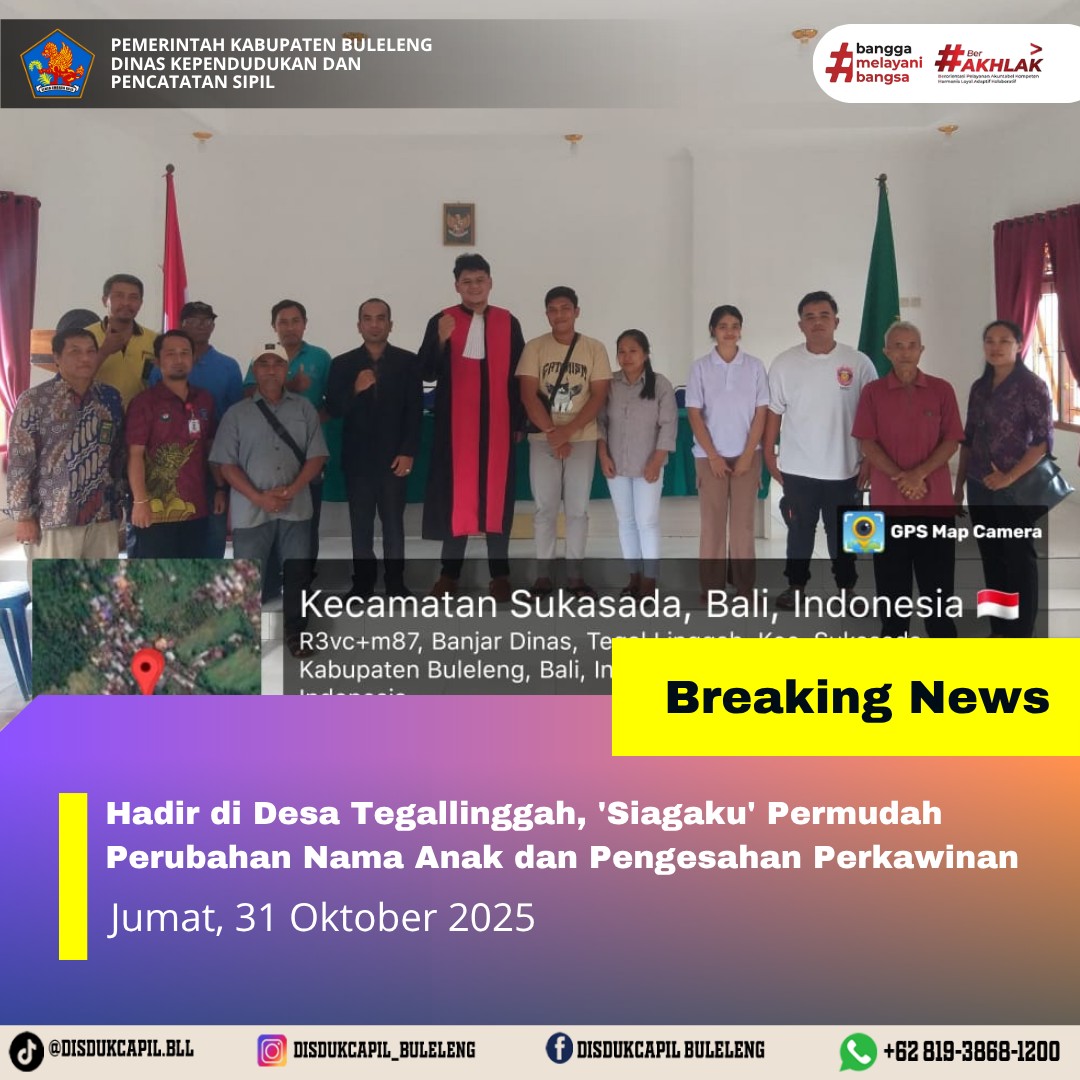 Buleleng, 31 Oktober 2025 - Pemerintah Kabupaten Buleleng melalui Dinas Kependudukan dan Pencatatan Sipil Kabupaten Buleleng bersama Pengadilan Negeri (PN) Singaraja Kelas IB secara nyata mendekatkan akses keadilan dan pelayanan administrasi kependudukan (adminduk) melalui inovasi terpadu yang diberi nama "Siagaku" (Sidang Luar Gedung dan Layanan Administrasi Kependudukan Terpadu).