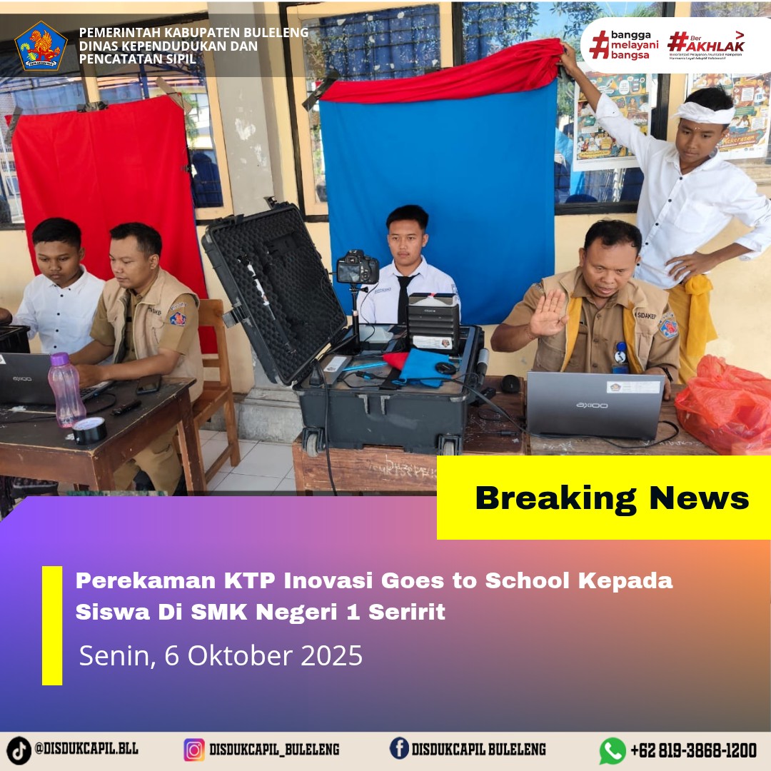 Pada kali ini Senin, 6 Oktober 2025 pelayanan perekaman KTP-el dilaksanakan di SMK Negeri 1 Seririt. Hasil perekaman di SMK Negeri 1 Seririt dengan data BNBA sebanyak 113 orang dan total yang melakukan perekaman sebanyak 101 orang, dimana hasil perekaman data di dalam BNBA yang melakukan perekaman sebanyak 8 orang dan data di luar BNBA sebanyak 93 orang yang melakukan perekaman. Sisa data dalam BNBA yang belum melakukan perekaman sebanyak 105 orang, keterangan dari pihak sekolah sisa BNBA dilanjutkan besoknya.
