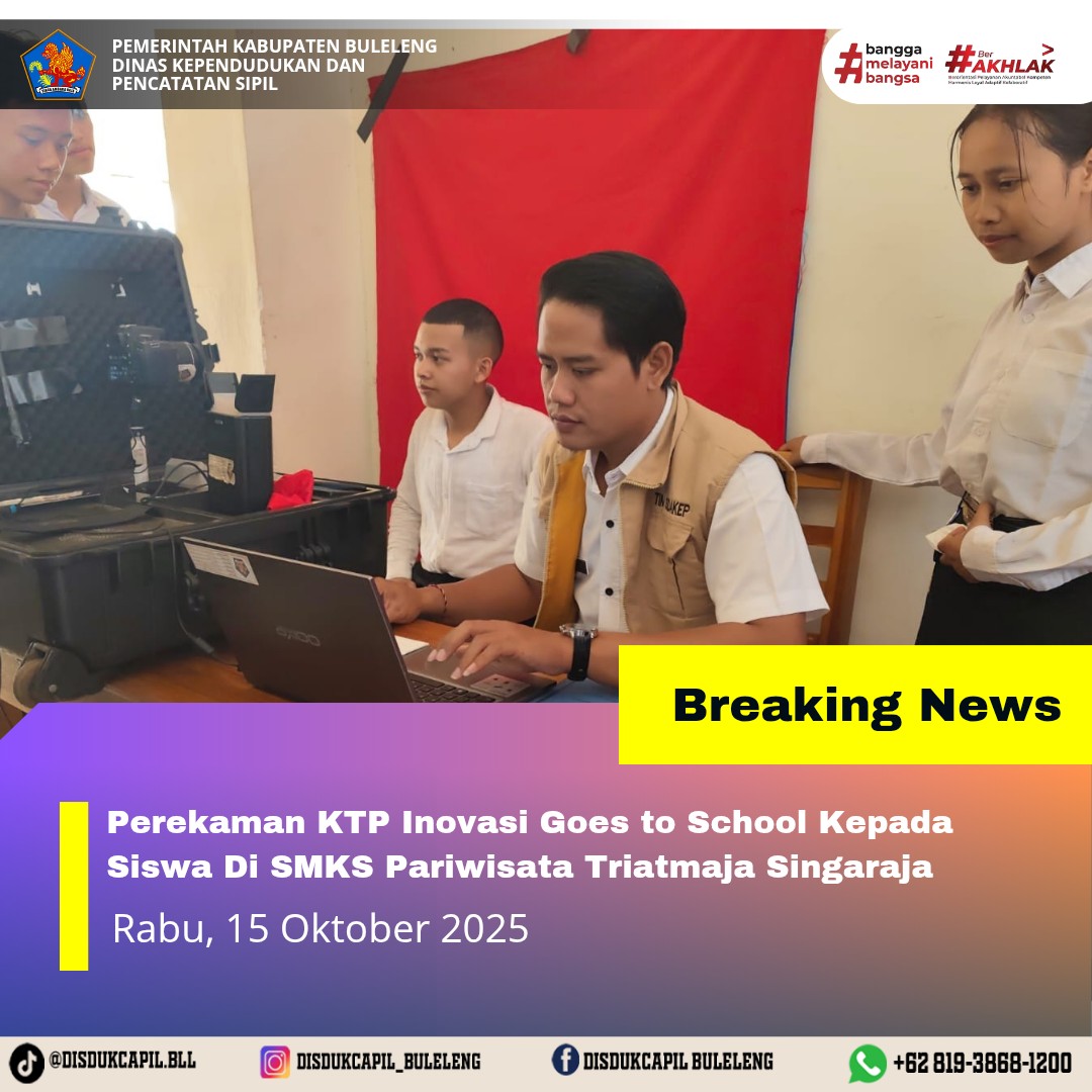 Pada kali ini Rabu, 15 Oktober 2025 pelayanan perekaman KTP-el dilaksanakan di SMKS Pariwisata Triatmaja Singaraja. Hasil perekaman di SMKS Pariwisata Triatmaja Singaraja dengan data BNBA sebanyak 74 orang dan total yang melakukan perekaman sebanyak 33 orang, dimana hasil perekaman data di dalam BNBA yang melakukan perekaman sebanyak 5 orang dan data di luar BNBA sebanyak 28 orang yang melakukan perekaman. Sisa data dalam BNBA yang belum melakukan perekaman sebanyak 69 orang, keterangan dari pihak sekolah sisa BNBA yang tidak hadir masih melaksanakan praktek.