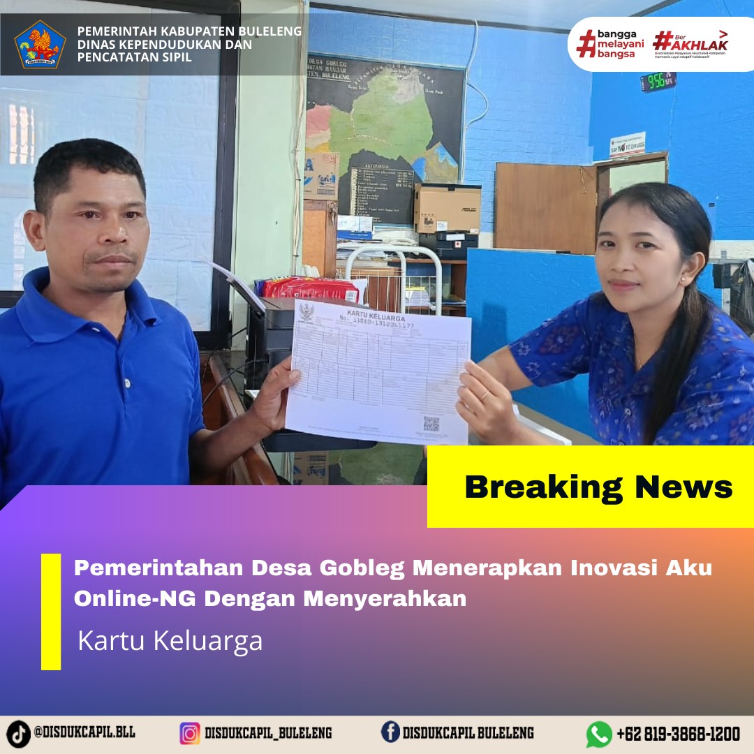 Pemerintah Kabupaten Buleleng melalui Dinas Kependudukan dan Pecatatan Sipil (Disdukcapil) Kabupaten Buleleng memaksimalkan serta mempermudah pelayanan kependudukan masyarakat dengan beberapa inovasi, melalui aplikasi AKU Online-NG. Dimana dalam penerapan aplikasi Aku Online-NG tersebut masyarakat tidak perlu lagi datang ke Dinas Dukcapil untuk melakukan pelayanan langsung cukup dengan datang ke Desa nanti akan dibantu oleh operator Desa masing-masing. Di Desa Gobleg Kecamatan Banjar, telah diserahkan dokumen kependudukan berupa Kartu Keluarga atas nama Nyoman Sukarma yang diserahkan langsung oleh staf administrasi Desa Gobleg bertempat di Kantor Perbekel Desa Gobleg, Kecamatan Banjar, Kabupaten Buleleng, Selasa (23/9).