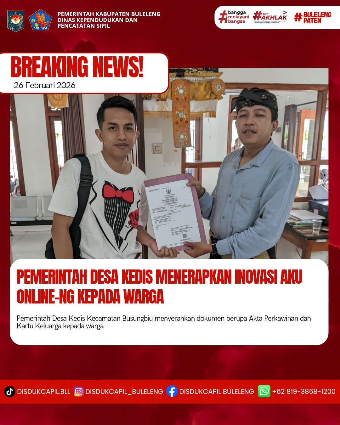 Pemerintah Kabupaten Buleleng melalui Dinas Kependudukan dan Pecatatan Sipil (Disdukcapil) Kabupaten Buleleng memaksimalkan serta mempermudah pelayanan kependudukan masyarakat dengan beberapa inovasi, melalui aplikasi AKU Online-NG. Dimana dalam penerapan aplikasi Aku Online-NG tersebut masyarakat tidak perlu lagi datang ke Dinas Dukcapil untuk melakukan pelayanan langsung cukup dengan datang ke Desa nanti akan dibantu oleh operator Desa masing-masing. Di Desa Kedis Kecamatan Busungbiu, telah diserahkan dokumen kependudukan berupa Akta Perkawinan dan Kartu Keluarga warga Banjar Dinas Kelod, yang diserahkan langsung oleh Kasi Pemerintahan Desa Kedis Kadek Dita Yudistira, Kamis (26/2).