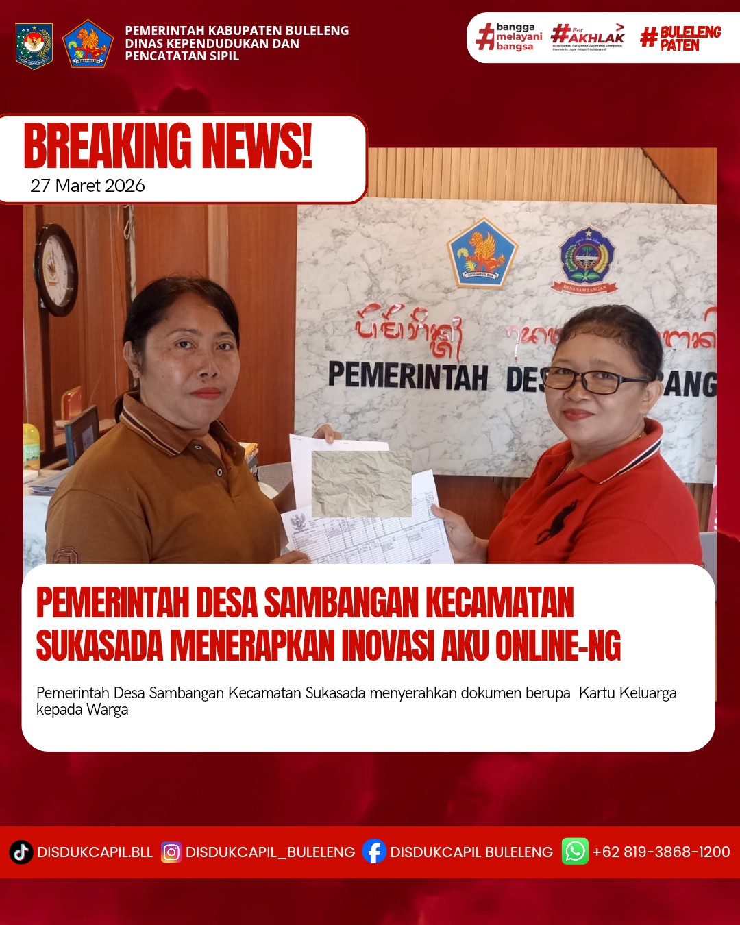 Pemerintah Kabupaten Buleleng melalui Dinas Kependudukan dan Pecatatan Sipil (Disdukcapil) Kabupaten Buleleng memaksimalkan serta mempermudah pelayanan kependudukan masyarakat dengan beberapa inovasi, melalui aplikasi AKU Online-NG. Dimana dalam penerapan aplikasi Aku Online-NG tersebut masyarakat tidak perlu lagi datang ke Dinas Dukcapil untuk melakukan pelayanan langsung, cukup dengan datang ke Desa nanti akan dibantu oleh operator Desa masing-masing. Di Desa Sambangan Kecamatan Sukasada, telah diserahkan dokumen kependudukan berupa Kartu Keluarga atas nama Putu Wirawan warga BD. Sambangan diserahkan oleh Kasi Pemerintahan Desa Sambangan yang bertempat di Kantor Perbekel Desa Sambangan, Kecamatan Sukasada, Kabupaten Buleleng, Jumat (27/3).