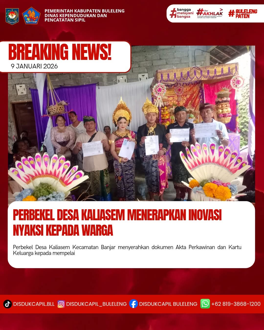 Pemerintah Kabupaten Buleleng melalui Dinas Kependudukan dan Pecatatan Sipil (Disdukcapil) Kabupaten Buleleng memaksimalkan serta mempermudah pelayanan kependudukan masyarakat dengan beberapa inovasi, yakni BALITA (Bayi Lahir Berakta), NYAKSI (Menyerahkan Akta Kawin Saat Acara Perkawinan) dan AKSAMA ( Akta Kematian Diserahkan Saat Masih Berduka) melalui aplikasi Aku Online-NG. Di Desa Kaliasem Kecamatan Banjar, telah diterapkan program NYAKSI (Menyerahkan Akta Perkawinan Saat Acara Perkawinan) yang dilakukan secara langsung oleh Perbekel Desa Kaliasem Ketut Sukiarta, SH dengan menyerahkan Akta Perkawinan atas nama Komang Pasek Mas dengan Putu Sefti Rianty dan Kartu Keluarga kepada kedua mempelai dan masing-masing orang tua mempelai di Banjar Dinas Pura Desa Kaliasem Kecamatan Banjar, Jumat (9/1).