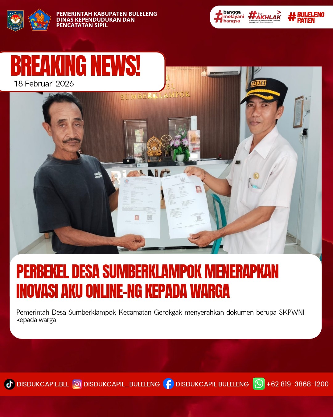 Pemerintah Kabupaten Buleleng melalui Dinas Kependudukan dan Pecatatan Sipil (Disdukcapil) Kabupaten Buleleng memaksimalkan serta mempermudah pelayanan kependudukan masyarakat dengan beberapa inovasi, melalui aplikasi AKU Online-NG. Dimana dalam penerapan aplikasi Aku Online-NG tersebut masyarakat tidak perlu lagi datang ke Dinas Dukcapil untuk melakukan pelayanan langsung cukup dengan datang ke Desa nanti akan dibantu oleh operator Desa masing-masing. Di Desa Sumberklampok Kecamatan Gerokgak, telah diserahkan dokumen kependudukan berupa SKPWNI atas nama Nengah Warka yang diserahkan secara langsung oleh Perbekel Desa Sumberklampok I Wayan Sawitrayasa bertempat di Kantor Perbekel Desa Sumberklampok, Kecamatan Gerokgak, Rabu (18/2).