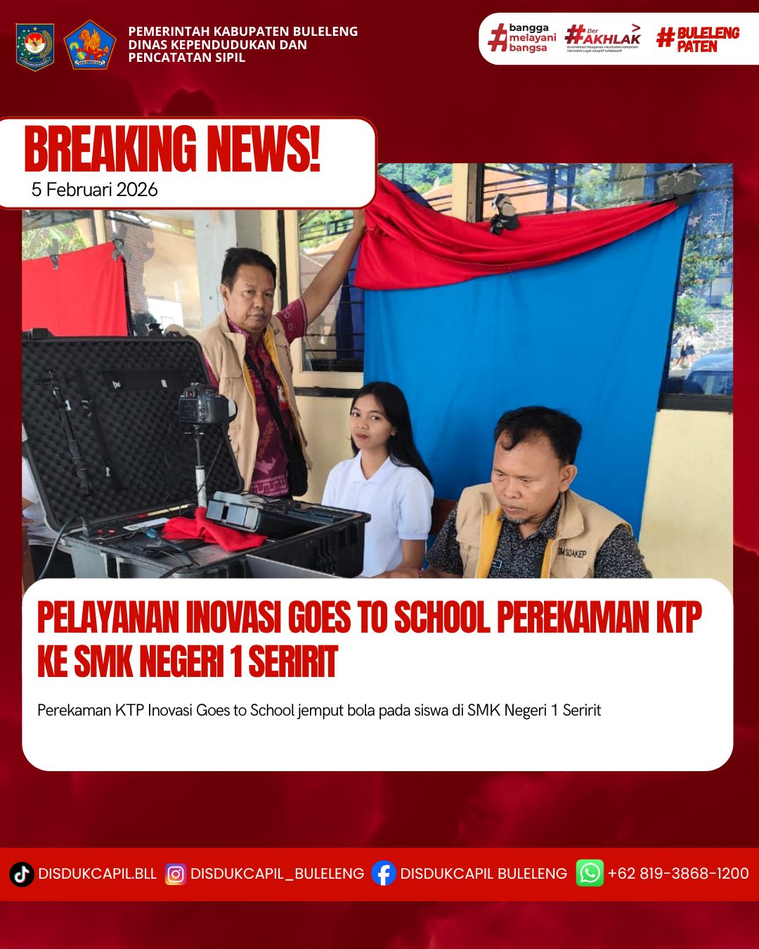 Pada kali ini Kamis, 5 Februari 2026 pelayanan perekaman KTP-el dilaksanakan di SMK Negeri 1 Seririt. Hasil perekaman di SMK Negeri 1 Seririt dengan data BNBA sebanyak 183 orang dan total yang melakukan perekaman sebanyak 25 orang, dimana hasil perekaman data di dalam BNBA sebanyak 25 orang dan tidak ada data di luar BNBA yang melakukan perekaman. Dilihat dari hasil tersebut sisa data BNBA yang belum perekaman sebanyak 158 orang informasi dari sekolah Siswa sudah dipanggil berkali-kali lewat pengeras suara, tetapi siswa tidak ada yang mau datang untuk melakukan perekaman.