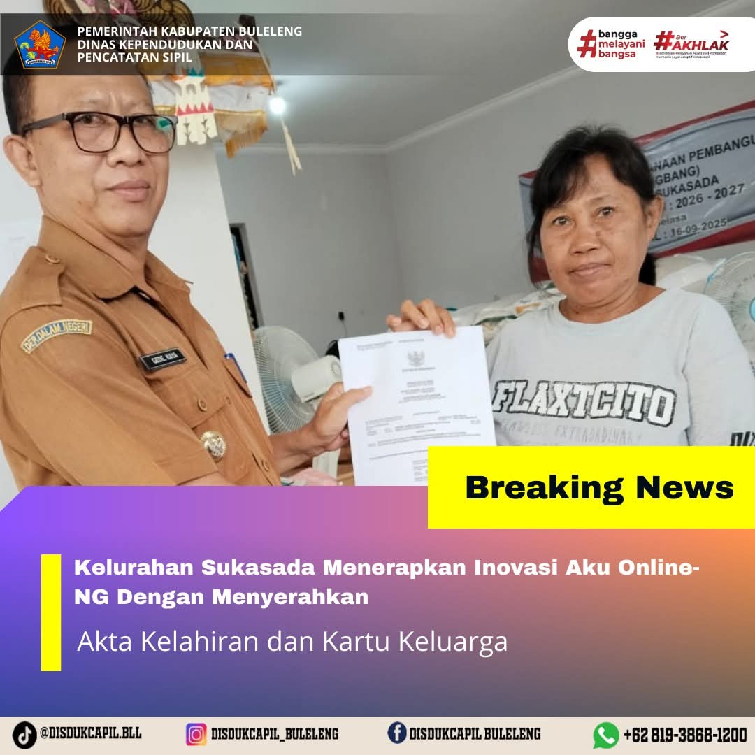 Pemerintah Kabupaten Buleleng melalui Dinas Kependudukan dan Pecatatan Sipil (Disdukcapil) Kabupaten Buleleng memaksimalkan serta mempermudah pelayanan kependudukan masyarakat dengan beberapa inovasi, melalui aplikasi AKU Online-NG. Dimana dalam penerapan aplikasi Aku Online-NG tersebut masyarakat tidak perlu lagi datang ke Dinas Dukcapil untuk melakukan pelayanan langsung cukup dengan datang ke Desa nanti akan dibantu oleh operator Desa masing-masing. Di Kelurahan Sukasada Kecamatan Sukasada, telah diserahkan dokumen kependudukan berupa Akta Kelahiran dan Kartu Keluarga atas nama Nengah Artini yang diserahkan langsung oleh Lurah Sukasada Kecamatan Sukasada bertempat di kantor Kelurahan Sukasada Kecamatan Sukasada, Kabupaten Buleleng, Senin (24/11).