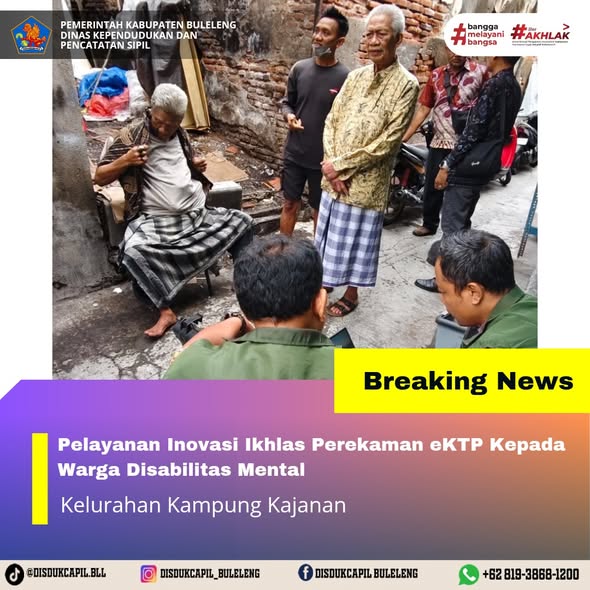 Dinas Kependudukan dan Pencatatan Sipil Kabupaten Buleleng terus berupaya memberikan pelayanan maksimal pada masyarakat dalam rangka meningkatkan kesadaran kepada masyarakat akan pentingnya memiliki dokumen kependudukan salah satunya Kartu Tanda Penduduk (KTP). Berbagai macam inovasi dikembangkan untuk mempermudah masyarakat dapat memiliki dokumen kependudukan. Salah satu Inovasi yang diberikan kepada masyarakat adalah Inovasi "IKHLAS" (Tim Khusus Layanan Untuk Orang Sakit dan Disabilitas) yaitu jembut bola perekaman KTP-el ke rumah warga yang tidak bisa datang langsung ke Kantor Disdukcapil untuk melakukan perekaman eKTP. Sesuai dengan Undang-Undang Republik Indonesia Nomor 24 Tahun 2013 tentang Administrasi Kependudukan, menyatakan bahwa Penduduk Warga Negara Indonesia dan Orang Asing yang memiliki Izin Tinggal Tetap yang telah berumur 17 (tujuh belas) tahun atau telah kawin atau pernah kawin wajib memiliki KTP-el. Namun demikian, ada beberapa penduduk yang tidak bisa datang langsung ke Kantor Dinas Kependudukan dan Pencatatan Sipil Kabupaten Buleleng karena kendala kesehatan dan usia lanjut.