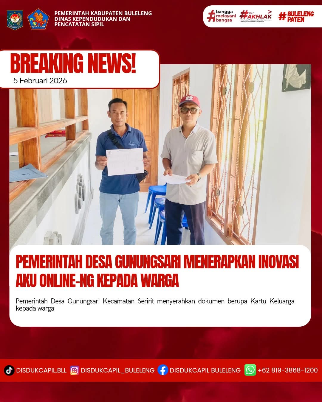 Pemerintah Kabupaten Buleleng melalui Dinas Kependudukan dan Pecatatan Sipil (Disdukcapil) Kabupaten Buleleng memaksimalkan serta mempermudah pelayanan kependudukan masyarakat dengan beberapa inovasi, melalui aplikasi AKU Online-NG. Dimana dalam penerapan aplikasi Aku Online-NG tersebut masyarakat tidak perlu lagi datang ke Dinas Dukcapil untuk melakukan pelayanan langsung cukup dengan datang ke Desa nanti akan dibantu oleh operator Desa masing-masing. Di Desa Gunungsari Kecamatan Seririt, telah diserahkan dokumen kependudukan berupa Kartu Keluarga atas nama Ketut Armada warga Banjar Dinas Sekar, Desa Gunungsari yang diserahkan oleh Pemerintah Desa Gunungsari kepada warga Banjar Dinas Sekar Desa Gunungsari, bertempat di Kantor Perbekel Desa Gunungsari, Kecamatan Seririt, Kabupaten Buleleng, Kamis (5/2).