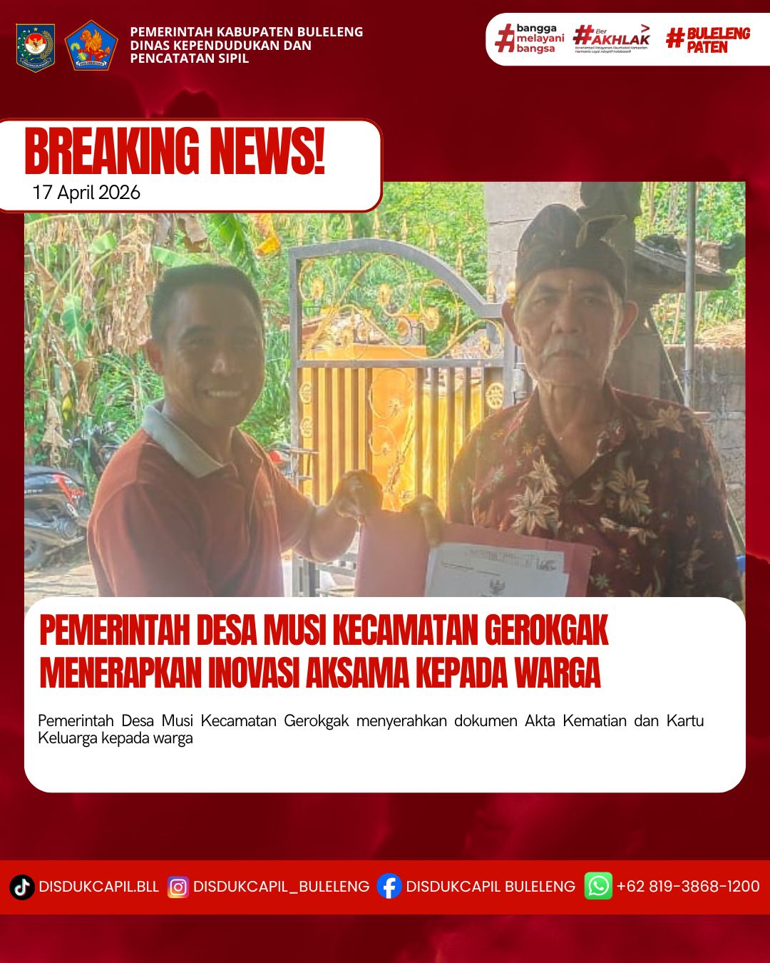 Pemerintah Kabupaten Buleleng melalui Dinas Kependudukan dan Pecatatan Sipil (Disdukcapil) Kabupaten Buleleng memaksimalkan serta mempermudah pelayanan kependudukan masyarakat dengan beberapa inovasi, yakni BALITA (Bayi Lahir Berakta), NYAKSI (Menyerahkan Akta Kawin Saat Acara Perkawinan) dan AKSAMA (Akta Kematian Diserahkan Saat Masih Berduka) melalui aplikasi Aku Online-NG. Di Desa Sawan Kecamatan Sawan, telah diterapkan program Aksama (Akta Kematian Diserahkan Saat Masih Berduka) yang dilakukan secara langsung oleh Kelian Banjar Dinas Madan, Desa Musi, Kecamatan Gerokgak dengan menyerahkan Akta Kematian dan Kartu Keluarga kepada keluarga almarhum diDesa Musi, Kecamatan Gerokgak, Jumat (17/4).