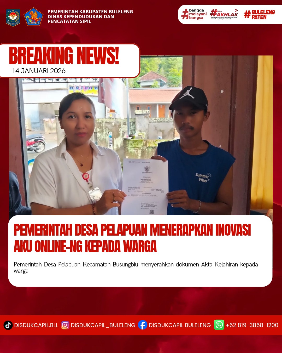 Pemerintah Kabupaten Buleleng melalui Dinas Kependudukan dan Pecatatan Sipil (Disdukcapil) Kabupaten Buleleng memaksimalkan serta mempermudah pelayanan kependudukan masyarakat dengan beberapa inovasi, melalui aplikasi AKU Online-NG. Dimana dalam penerapan aplikasi Aku Online-NG tersebut masyarakat tidak perlu lagi datang ke Dinas Dukcapil untuk melakukan pelayanan langsung cukup dengan datang ke Desa nanti akan dibantu oleh operator Desa masing-masing. Di Desa Pelapuan Kecamatan Busungbiu, telah diserahkan dokumen kependudukan berupa Akta Kelahiran karena hilang atas nama Ketut Aris Sisiawan warga Banjar Dinas Pelapuan yang diserahkan oleh Kasi Pemerintahan Desa Pelapuan bertempat di Kantor Perbekel Desa Pelapuan, Kecamatan Busungbiu, Kabupaten Buleleng, Rabu (14/1).