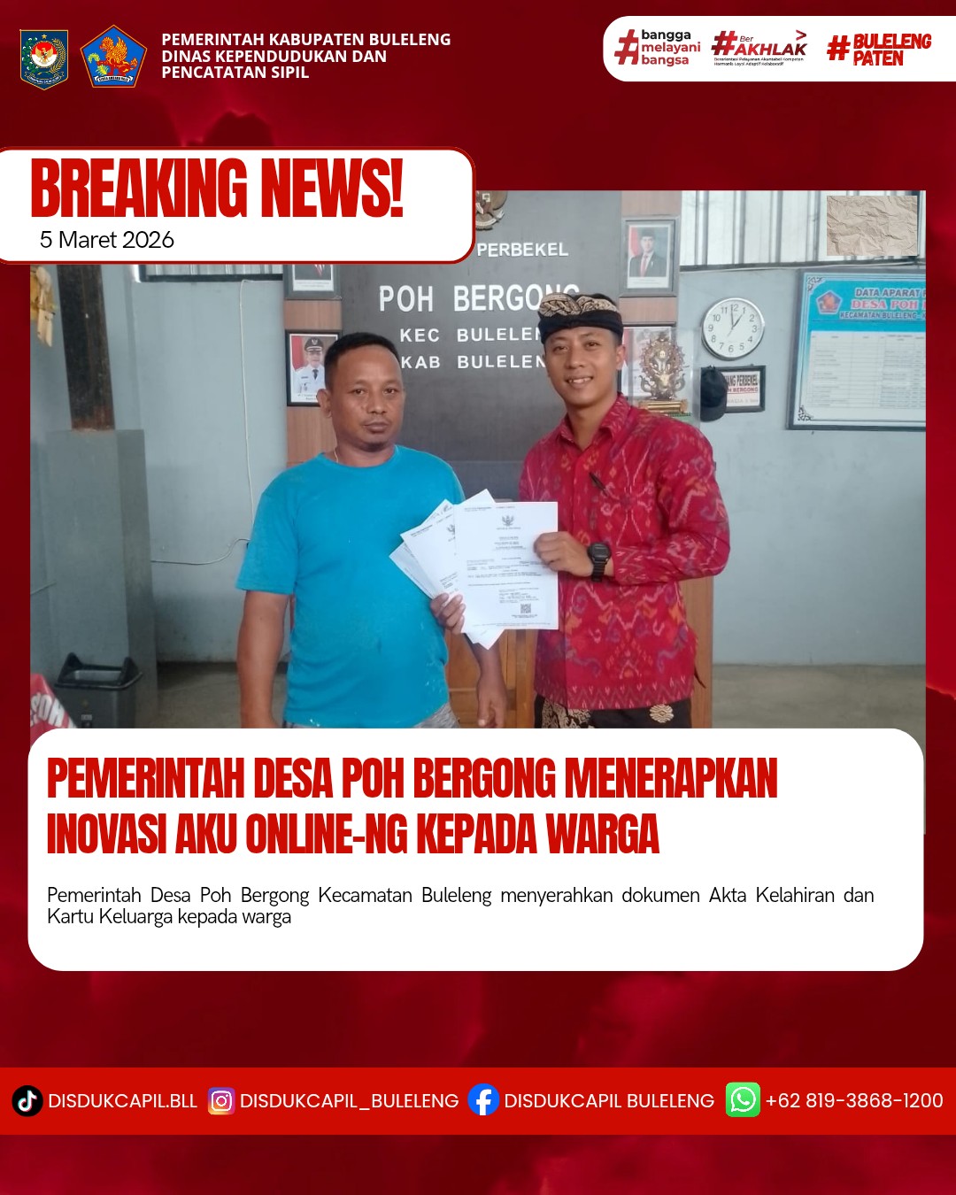 Pemerintah Kabupaten Buleleng melalui Dinas Kependudukan dan Pecatatan Sipil (Disdukcapil) Kabupaten Buleleng memaksimalkan serta mempermudah pelayanan kependudukan masyarakat dengan beberapa inovasi, melalui aplikasi AKU Online. Dimana dalam penerapan aplikasi Aku Online tersebut masyarakat tidak perlu lagi datang ke Dinas Dukcapil untuk melakukan pelayanan langsung cukup dengan datang ke Desa nanti akan dibantu oleh operator Desa masing-masing. Di Desa Poh Bergong Kecamatan Buleleng telah diserahkan dokumen kependudukan berupa Akta Kelahiran dan Kartu Keluarga yang diserahkan langsung oleh Operator Aku Online-NG Desa Poh Bergong Kecamatan Buleleng, Kamis (5/3).