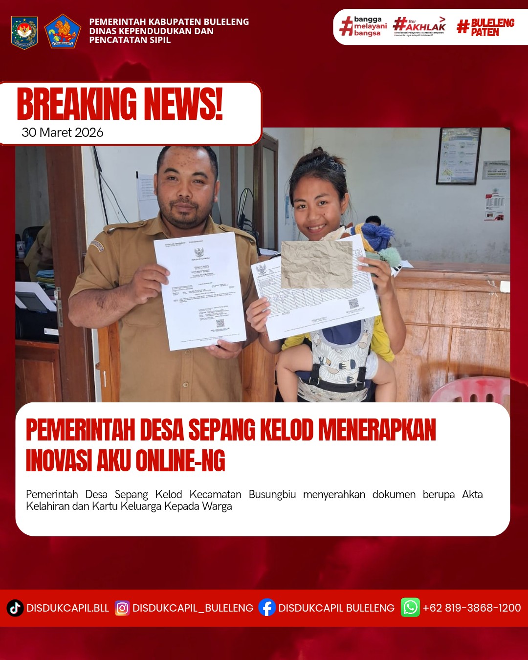 Pemerintah Kabupaten Buleleng melalui Dinas Kependudukan dan Pecatatan Sipil (Disdukcapil) Kabupaten Buleleng memaksimalkan serta mempermudah pelayanan kependudukan masyarakat dengan beberapa inovasi, melalui aplikasi AKU Online. Dimana dalam penerapan aplikasi Aku Online tersebut masyarakat tidak perlu lagi datang ke Dinas Dukcapil untuk melakukan pelayanan langsung, cukup dengan datang ke Desa nanti akan dibantu oleh operator Desa masing-masing. Di Desa Sepang Kelod Kecamatan Busungbiu telah diserahkan dokumen kependudukan berupa Akta Kelahiran dan Kartu Keluarga warga Banjar Dinas Asah Badung, Desa Sepang kelod Kecamatan Busungbiu yang diserahkan oleh Kasi Pemerintahan Desa Sepang Kelod, bertempat di Kantor Perbekel Desa Sepang Kelod, Kecamatan Busungbiu, Senin (30/3).