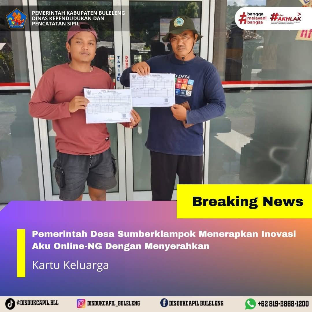 Pemerintah Kabupaten Buleleng melalui Dinas Kependudukan dan Pecatatan Sipil (Disdukcapil) Kabupaten Buleleng memaksimalkan serta mempermudah pelayanan kependudukan masyarakat dengan beberapa inovasi, melalui aplikasi AKU Online-NG. Dimana dalam penerapan aplikasi Aku Online-NG tersebut masyarakat tidak perlu lagi datang ke Dinas Dukcapil untuk melakukan pelayanan langsung cukup dengan datang ke Desa nanti akan dibantu oleh operator Desa masing-masing. Di Desa Sumberklampok Kecamatan Gerokgak, telah diserahkan dokumen kependudukan berupa Kartu Keluarga atas nama Agus Susanto dan Hairul Razikin yang diserahkan secara langsung oleh Kelian Banjar Dinas Sumberbatok Wayan Wira Desa Sumberklampok Kecamatan Gerokgak, Rabu (3/12).