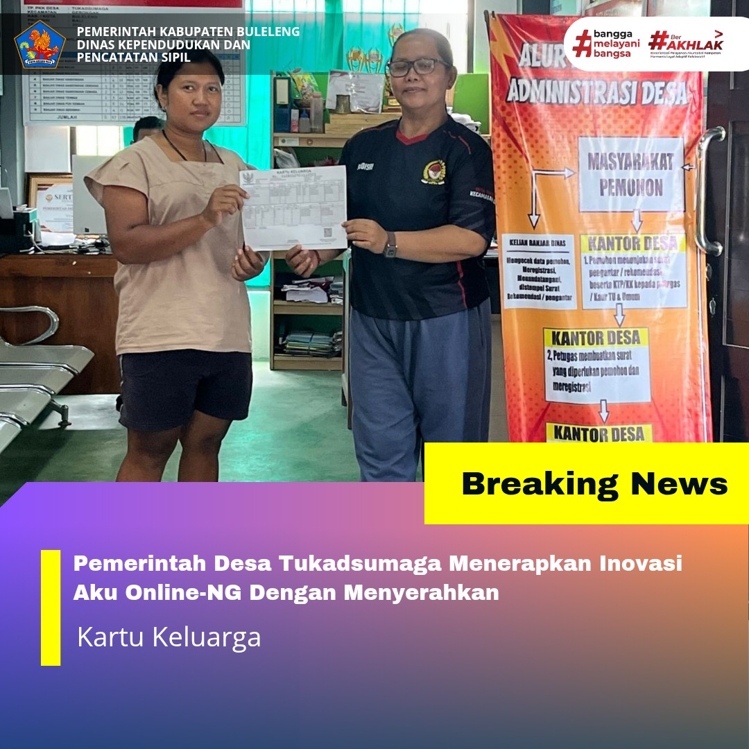 Pemerintah Kabupaten Buleleng melalui Dinas Kependudukan dan Pecatatan Sipil (Disdukcapil) Kabupaten Buleleng memaksimalkan serta mempermudah pelayanan kependudukan masyarakat dengan beberapa inovasi, melalui aplikasi AKU Online-NG. Dimana dalam penerapan aplikasi Aku Online-NG tersebut masyarakat tidak perlu lagi datang ke Dinas Dukcapil untuk melakukan pelayanan langsung cukup dengan datang ke Desa nanti akan dibantu oleh operator Desa masing-masing. Di Desa Tukadsumaga Kecamatan Gerokgak, telah diserahkan dokumen kependudukan berupa kartu keluarga atas nama I GEDE ERI IRAWAN yang diserahkan oleh Kasi Pemerintahan Made Budisri Adnyani kepada warga Desa Tukadsumaga, Jumat (14/11).