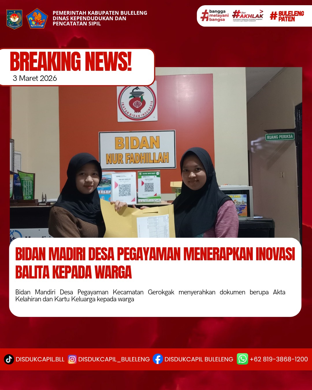 Pemerintah Kabupaten Buleleng melalui Dinas Kependudukan dan Pencatatan Sipil (Disdukcapil) Kabupaten Buleleng memaksimalkan serta mempermudah pelayanan kependudukan masyarakat dengan beberapa inovasi, yakni BALITA (Bayi Lahir Berakta), NYAKSI (Menyerahkan Akta Kawin Saat Acara Perkawinan) dan AKSAMA ( Akta Kematian Diserahkan Saat Masih Berduka) melalui aplikasi Aku Online-NG. Di Desa Pegayaman, Kecamatan Sukasada, telah diterapkan inovasi pelayanan BALITA (Bayi Lahir Berakta) dengan menyerahkan Akta Kelahiran dan Kartu Keluarga (KK) yang dilakukan secara langsung oleh Bidan Mandiri Nur Fadhillah kepada masyarakat yang baru memiliki bayi, Selasa (11/3).