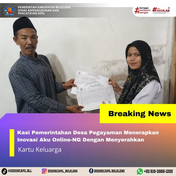 Pemerintah Kabupaten Buleleng melalui Dinas Kependudukan dan Pecatatan Sipil (Disdukcapil) Kabupaten Buleleng memaksimalkan serta mempermudah pelayanan kependudukan masyarakat dengan beberapa inovasi, melalui aplikasi AKU Online-NG. Dimana dalam penerapan aplikasi Aku Online-NG tersebut masyarakat tidak perlu lagi datang ke Dinas Dukcapil untuk melakukan pelayanan langsung cukup dengan datang ke Desa nanti akan dibantu oleh operator Desa masing-masing. Di Desa Pegayaman Kecamatan Sukasada, telah diserahkan dokumen kependudukan berupa Kartu Keluarga kepada warga atas nama M.Amrillah Riduan yang beralamat di Banjar Dinas Kubu Desa Pegayaman yang diserahkan langsung oleh Kasi Pemerintahan Desa Pegayaman, Rabu (27/8).