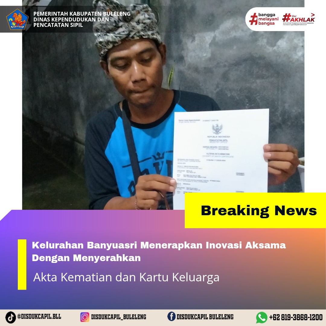 Pemerintah Kabupaten Buleleng melalui Dinas Kependudukan dan Pecatatan Sipil (Disdukcapil) Kabupaten Buleleng memaksimalkan serta mempermudah pelayanan kependudukan masyarakat dengan beberapa inovasi, yakni BALITA (Bayi Lahir Berakta), NYAKSI (Menyerahkan Akta Kawin Saat Acara Perkawinan) dan AKSAMA ( Akta Kematian Diserahkan Saat Masih Berduka) melalui aplikasi Aku Online. Di Kelurahan Banyuasri Kecamatan Buleleng, telah diterapkan program Aksama (Akta Kematian Diserahkan Saat Masih Berduka) yang dilakukan secara langsung oleh Kaling Kelurahan Banyuasri dengan menyerahkan Akta Kematian atas nama Nyoman Suka dan Kartu Keluarga kepada pihak keluarga almarhum di jalan Teratai 5 No 7 Kelurahan Banyuasri, Kamis (11/12).