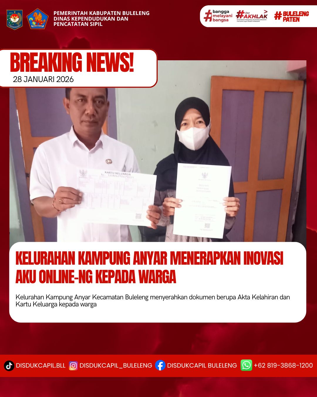 Pemerintah Kabupaten Buleleng melalui Dinas Kependudukan dan Pecatatan Sipil (Disdukcapil) Kabupaten Buleleng memaksimalkan serta mempermudah pelayanan kependudukan masyarakat dengan beberapa inovasi, melalui aplikasi AKU Online-NG. Dimana dalam penerapan aplikasi Aku Online-NG tersebut masyarakat tidak perlu lagi datang ke Dinas Dukcapil untuk melakukan pelayanan langsung cukup dengan datang ke Desa nanti akan dibantu oleh operator Desa masing-masing. Di Kelurahan Kampung Anyar Kecamatan Buleleng, telah diserahkan dokumen kependudukan berupa Akta Kelahiran dan Kartu Keluarga atas nama Kadaria yang diserahkan langsung oleh Kelurahan Kampung Anyar Kecamatan Buleleng, Kabupaten Buleleng, Rabu (28/1).