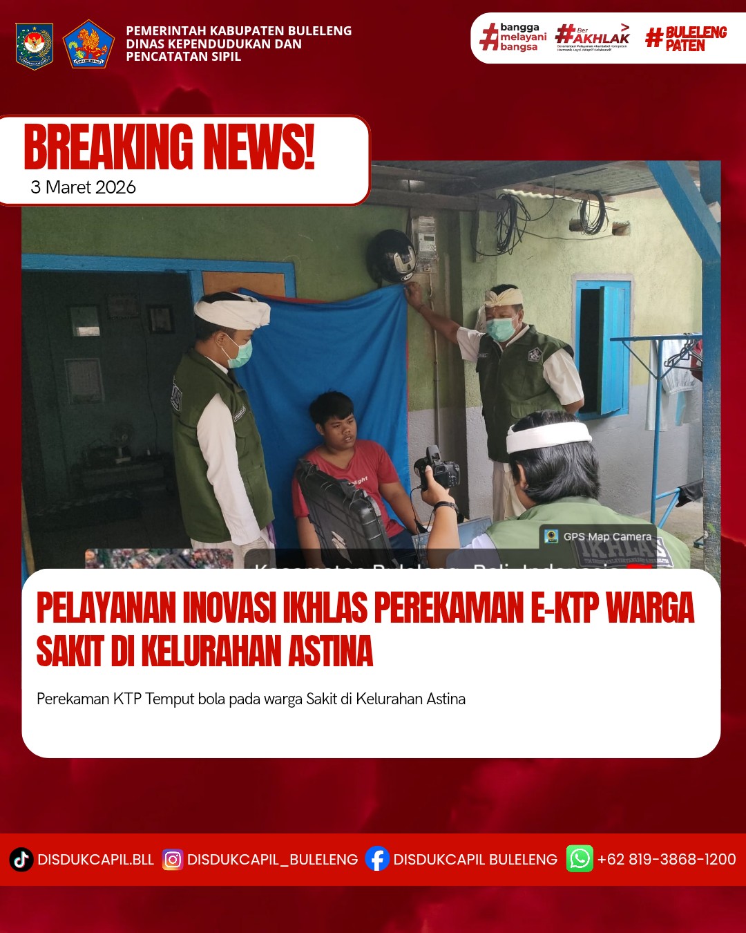 Pada hari ini Selasa, 3 Maret 2026 Dinas Kependudukan dan Pencatatan Sipil Kabupaten Buleleng melaksanakan penerapan Inovasi Ikhlas dengan melakukan jemput bola kepada masyarakat untuk melakukan perekaman KTP-El kepada warga Sakit di Kelurahan Astina atas nama :