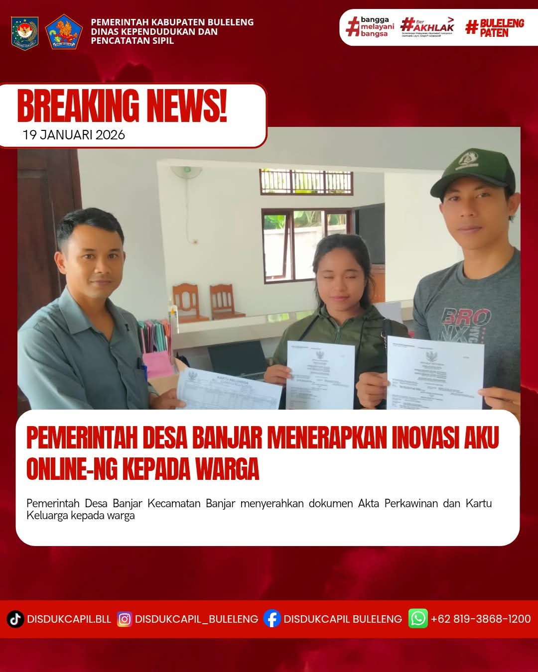 Pemerintah Kabupaten Buleleng melalui Dinas Kependudukan dan Pecatatan Sipil (Disdukcapil) Kabupaten Buleleng memaksimalkan serta mempermudah pelayanan kependudukan masyarakat dengan beberapa inovasi, melalui aplikasi AKU Online-NG. Dimana dalam penerapan aplikasi Aku Online-NG tersebut masyarakat tidak perlu lagi datang ke Dinas Dukcapil untuk melakukan pelayanan langsung cukup dengan datang ke Desa nanti akan dibantu oleh operator Desa masing-masing. Di Desa Banjar Kecamatan Banjar, telah diserahkan dokumen kependudukan berupa Akta Perkawinan dan Kartu Keluarga atas nama Gusti Kadek Suadnyana warga Banjar Dinas Pegentengan Desa Banjar yang diserahkan langsung oleh KBD Pegentengan, Pemerintah Desa Banjar Kecamatan Banjar, Kabupaten Buleleng, Senin (19/1).