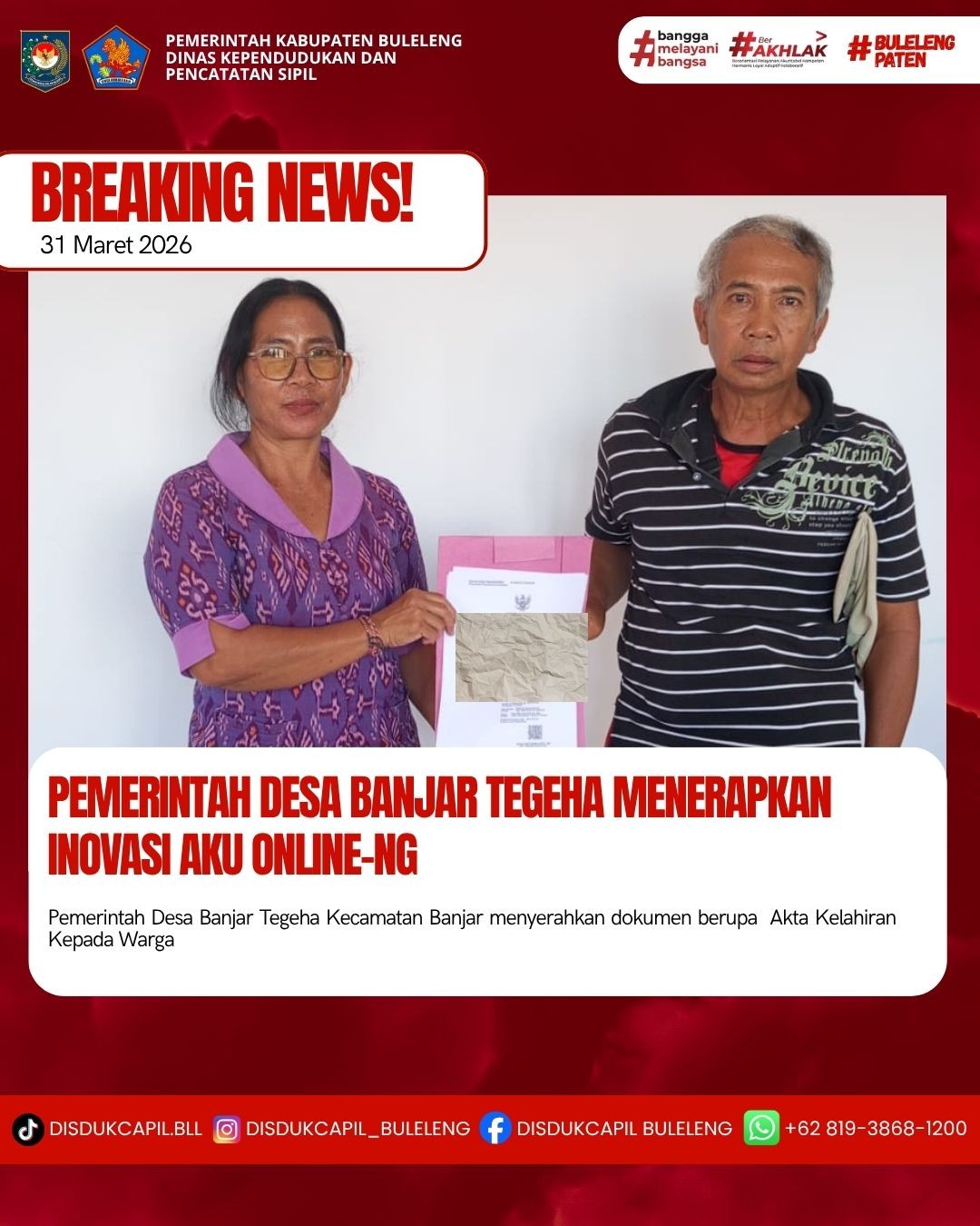 Pemerintah Kabupaten Buleleng melalui Dinas Kependudukan dan Pecatatan Sipil (Disdukcapil) Kabupaten Buleleng memaksimalkan serta mempermudah pelayanan kependudukan masyarakat dengan beberapa inovasi, melalui aplikasi AKU Online-NG. Dimana dalam penerapan aplikasi Aku Online-NG tersebut masyarakat tidak perlu lagi datang ke Dinas Dukcapil untuk melakukan pelayanan langsung cukup dengan datang ke Desa nanti akan dibantu oleh operator Desa masing-masing. Di Desa Banjar Tegeha Kecamatan Banjar, telah diserahkan dokumen kependudukan berupa Akta Kelahiran karena hilang yang diserahkan secara langsung oleh Kaur Tata usaha dan umum Ketut Karoni, Selasa (31/3).