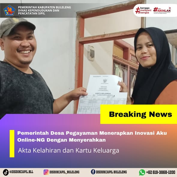 Pemerintah Kabupaten Buleleng melalui Dinas Kependudukan dan Pecatatan Sipil (Disdukcapil) Kabupaten Buleleng memaksimalkan serta mempermudah pelayanan kependudukan masyarakat dengan beberapa inovasi, melalui aplikasi AKU Online-NG. Dimana dalam penerapan aplikasi Aku Online-NG tersebut masyarakat tidak perlu lagi datang ke Dinas Dukcapil untuk melakukan pelayanan langsung cukup dengan datang ke Desa nanti akan dibantu oleh operator Desa masing-masing. Di Desa Pegayaman Kecamatan Sukasada, telah diserahkan dokumen kependudukan berupa Akta Kelahiran dan Kartu Keluarga atas nama Ali Purnama yang beralamat di Banjar Dinas Barat Jalan Desa Pegayaman yang diserahkan langsung oleh Kasi Pemerintahan Desa Pegayaman, Kamis (30/10).
